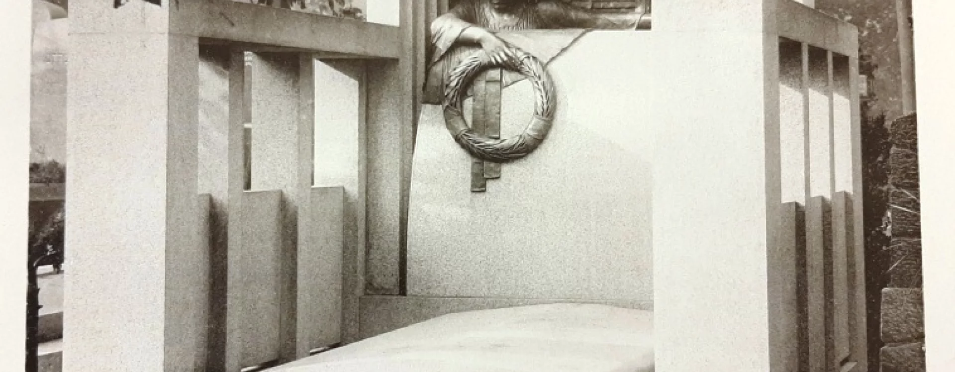 Using highly modern means, the Neoclassical design's colonnade suggestively alludes to the motif of a temple while also evoking a sense of intimacy in the semi-enclosed space above the simple ledger. This arrangement forms a kind of stone bed in front of a "window into the hereafter," through which gazes a mourning figure: a bronze statue of a woman leaning against the stele and looking down upon the crypt, her right hand holding a laurel wreath over flowing drapery. For this decorative element, the Dejvice sculptor Jaroslav Jindřích Vorel (1874–1936) drew on timeless symbolism: as a funerary symbol in Europe and elsewhere, the wreath is ascribed magical powers by virtue of its circular form signifying perfection and immortality. The floral decoration behind the female sculpture in the form of luxuriant bronze foliage reflects typical Art Nouveau themes while also contrasting with the refined simplicity of the architecture. The motif of a temple of death (or perhaps a celebration of life after death) is further emphasized by the classicist roof.