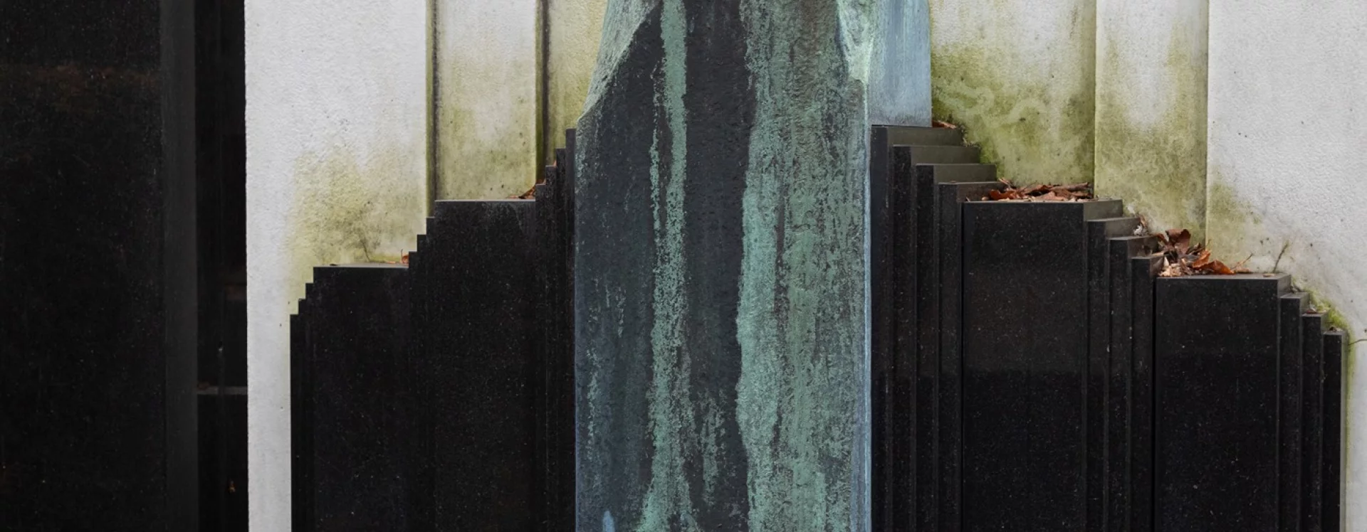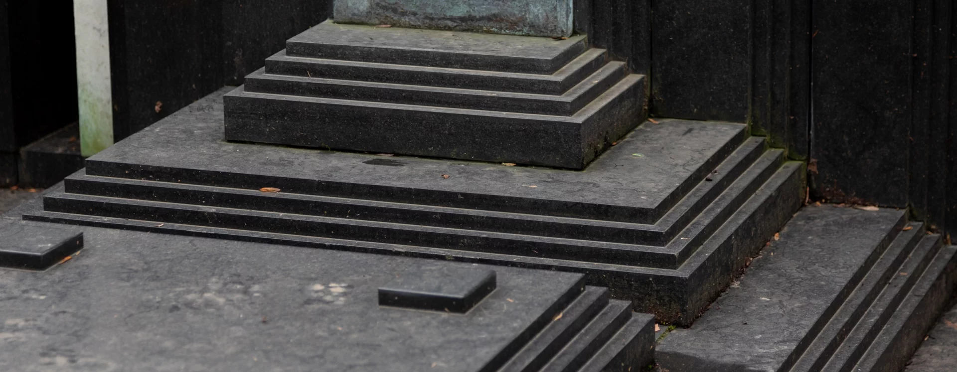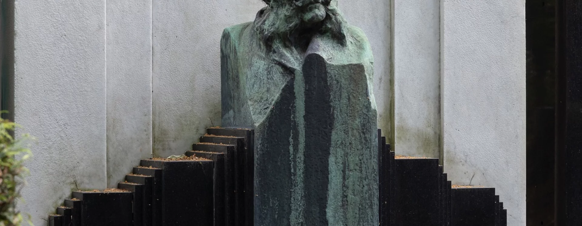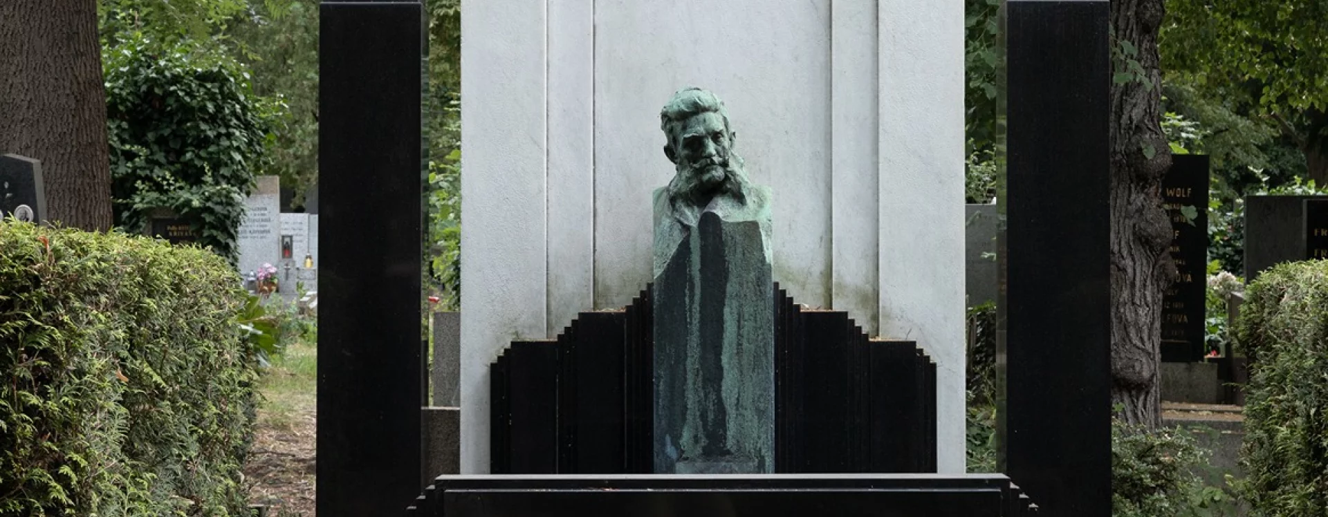 Novotný designed the monument as a kind of bed. At its head is a tall stele with a likeness of the deceased; at its foot is a lower plaque with an inscription. The effect of this unusual composition is amplified in particular by the contrast between the exclusive white and black materials, the choice of which is documented among other things by a 1909 note from the stonemasonry business of Ludvík Šalda: "The lower part of the structure will be on three levels, with a lower area for collecting water made of bricks and cement mortar. The upper part will be of polished black Swedish granite and white Carrara marble, and the decoration and bust will be bronze." Thanks to the perfect interplay of geometric surfaces and the contrasting colors of the stone, the monument is a visually highly impressive work. The tall white stele, its rear side decorated with the letter "N," is flanked by a pair of black obelisks. Black material was also used for the horizontal surface of the ledger stone and the inscription plaque. Initially featuring a modern relief typeface, it was covered by a plaque with a new inscription in 2016.
