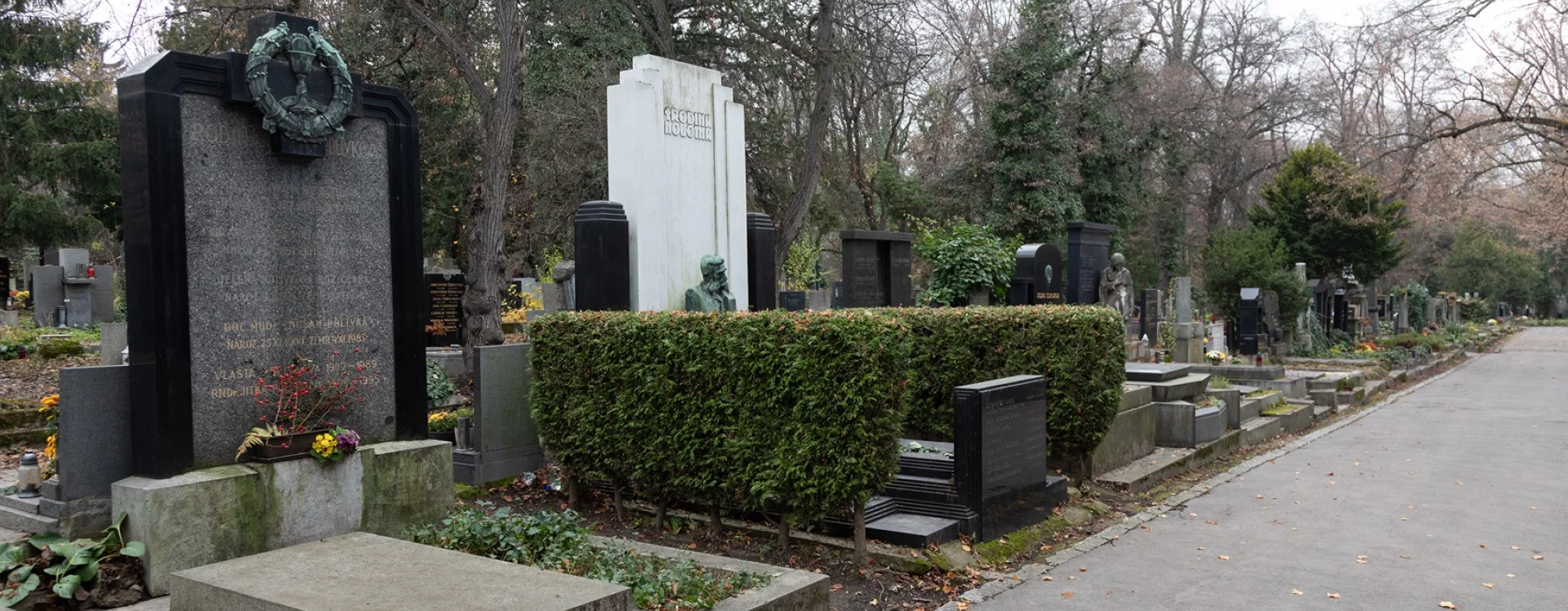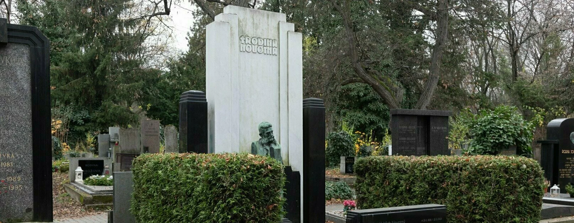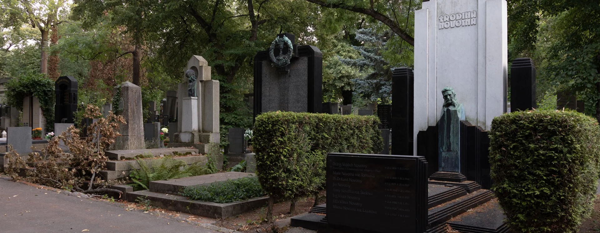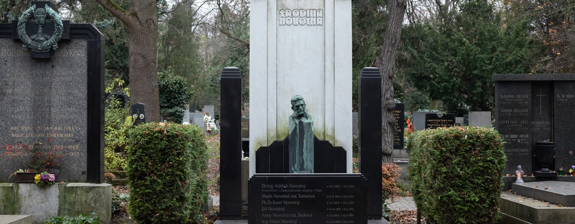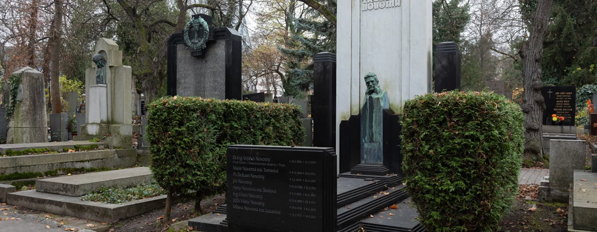 The architect Otakar Novotný was buried at the Vinohrady cemetery, as was his son Jiří Novotný (1911‒2000), an architect and urban planner whose works include the highly valued urban designs for the Invalidovna, Prosek, and Ďáblice housing estates in Prague.