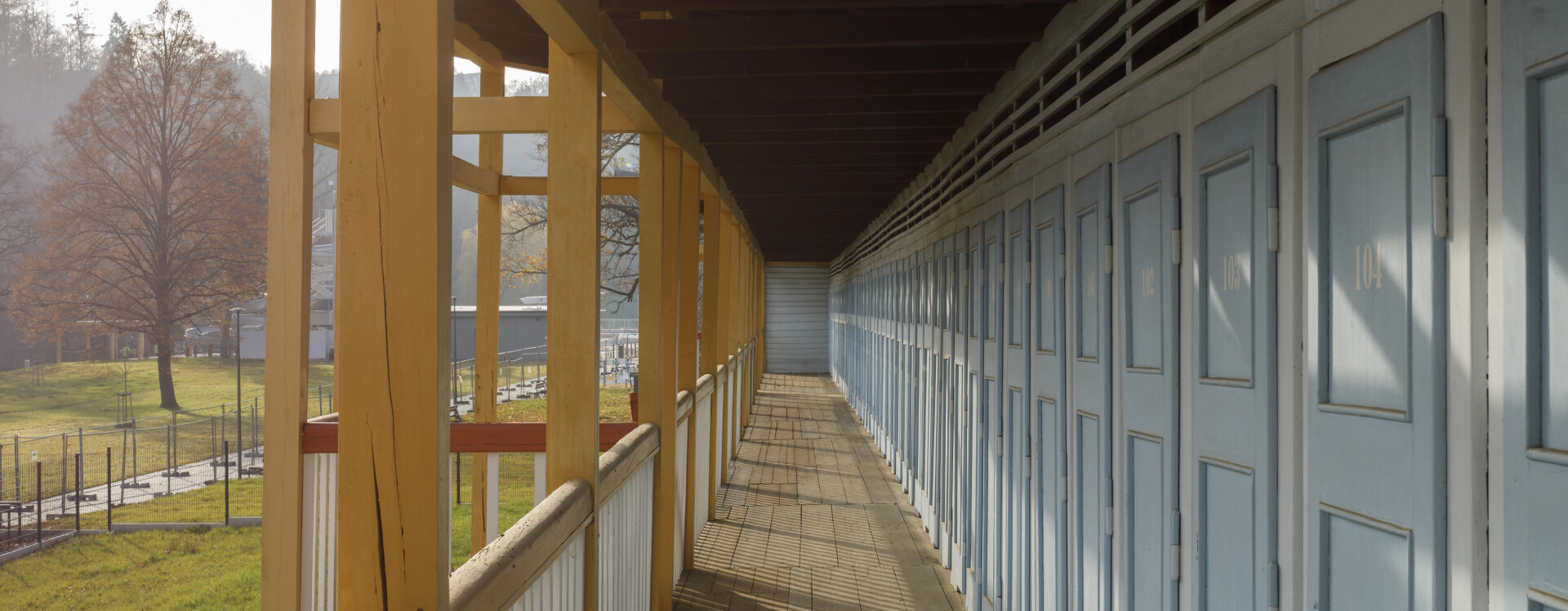 Dvoupodlažní objekt převlékacích kabin je koncipován jako subtilní dřevěná skeletová stavba na půdorysu protáhlého písmene L se čtyřmi předsazenými schodišti. Po celé délce podlaží je veden otevřený ochoz, na který navazují převlékací kabiny uzavřené kazetovými dveřmi. Dispozice jednotlivých křídel se liší podle funkčního členění, přičemž centrální část v přízemí byla určena pro občerstvení a hygienické zázemí. Pultová střecha s mírným sklonem je nesena dřevěnými sloupy přes obě podlaží a kryta plechem. Budova převlékáren se dochovala ve vysoké míře autenticity, včetně původní dřevěné konstrukce, dispozičního řešení i řady detailů ( pouze původní barevnost se nepodařilo zjistit, ta současná je novodobá) a v roce 2011 byla prohlášena kulturní památkou.