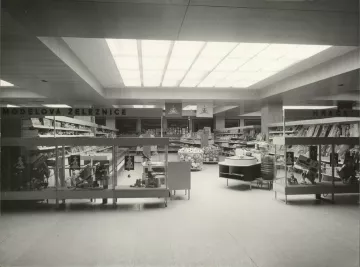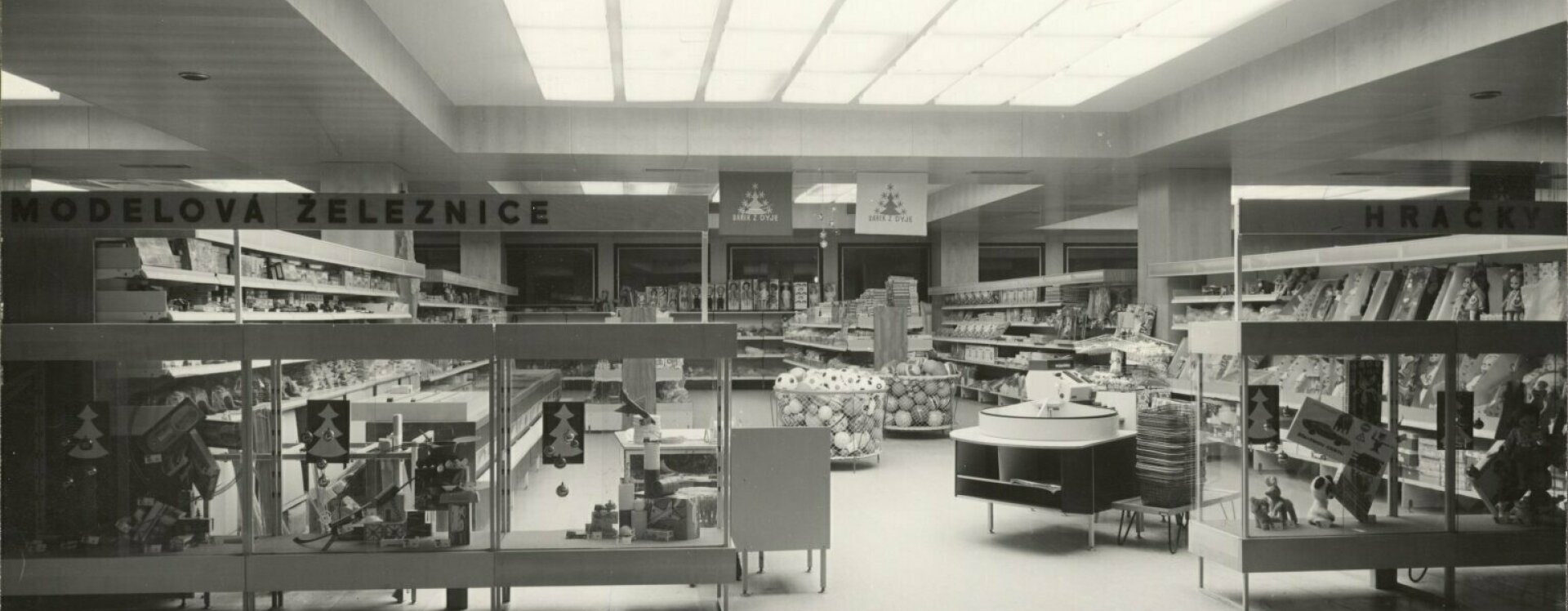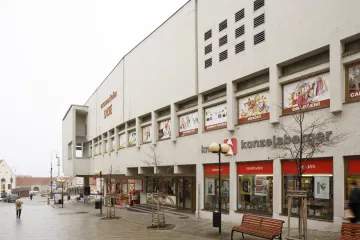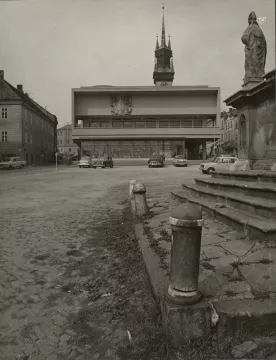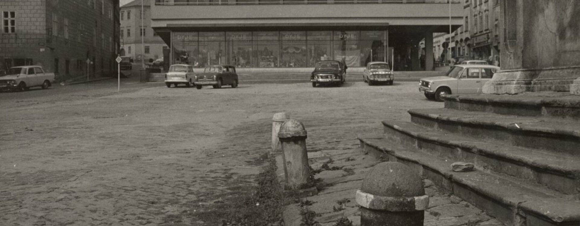 Nešťastně svrhnutá puma na konci války sklouzla po radniční věži a částečně poničila budovy pod ní. Namísto oprav přišlo bourání. Prvotní plány na velkolepou novou radnici se nerealizovaly a poničený blok budov spolu s třípatrovým nájemním domem s obchody v přízemí nahradila prázdná travnatá plocha. Tu až v 70. letech vyplnila novostavba obchodního domu Dyje dle projektu Bohuslava a Kamila Fuchsových, otce a syna. Neofunkcionalistické kvádrové tvary, horizontální okenní pás a nadlehčené přízemí v jejich stavbě doplňuje brutalismus čistotou materiálu neomítaného betonu, zjemněného reliéfem znojemské orlice od Jiřího Marka. Svojí poslední stavbou se Bohuslav Fuchs odkazuje k velkému vzoru švýcarského architekta Le Corbusiera. Z jeho vily Savoy (1928-1931) přenesl Fuchs do centra Znojma nadlehčené prosklené přízemí, výrazně horizontální průčelí i okrouhlý prvek na rovné střeše.