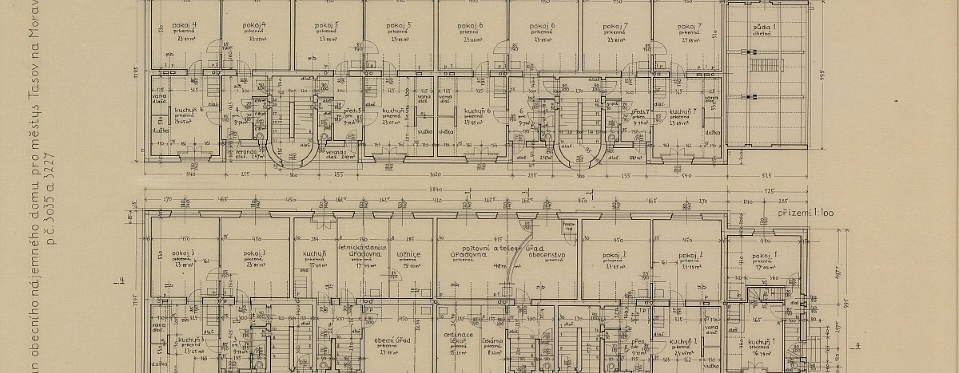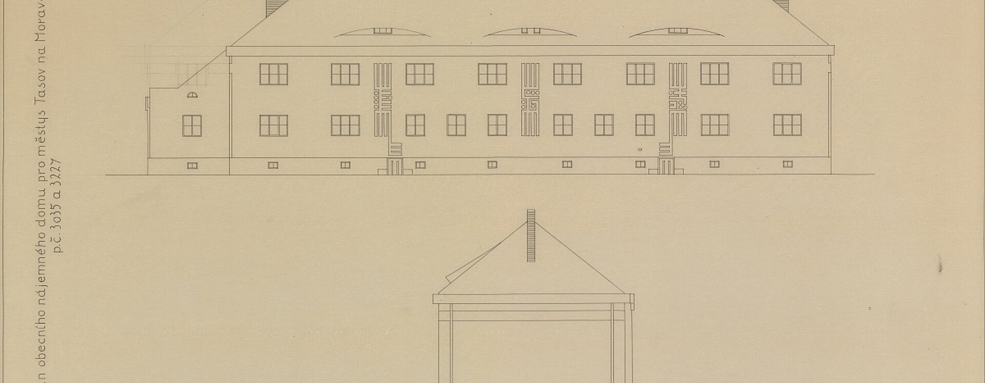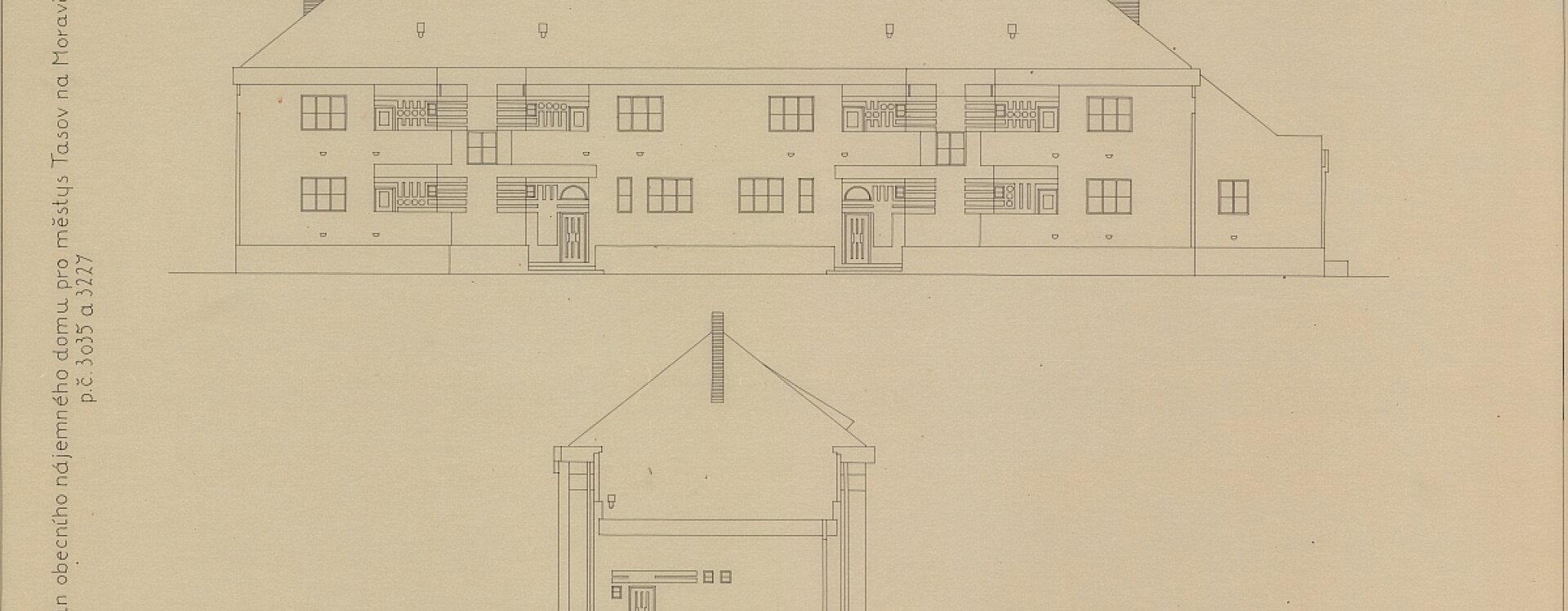 Zakázku na obecní nájemní dům v Tasově získal Bohuslav Fuchs pravděpodobně díky svým kontaktům s místní samosprávou, které navázal při stavebních řízeních probíhajících od roku 1921 v souvislosti s výstavbou rodinného domu Jakuba Demla. Zatímco básníkův dům navrhl v tzv. národním slohu, kombinující prvky rondokubismu a lidového stavitelství, v případě obecního domu z roku 1922 Fuchs zvolil jiné architektonické tvarosloví inspirované holandskou architekturou. Původně obec architektovi zadala vyprojektovat multifunkční dvoupodlažní obecní dům s velkým kulturním sálem s jevištěm i promítací komorou, v jehož prvním patře měla být vybudována městská knihovna. Druhý trakt počítal s přízemím s veřejnými funkcemi obecní úřadovny, četnické stanice, pošty, telegrafu a lékařské ordinace s čekárnou, a se dvěma obecními obecními byty ve zbylé části přízemí a čtyřmi patře. Každý z bytů byl zařízen kuchyní a malou místnost pro služku orientovanými k severu, a dvěma obytnými pokoji jejíž okna byla otočena na jih. Byty byly na svou dobu moderně vybaveny koupelnou s vanou.