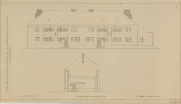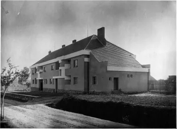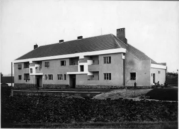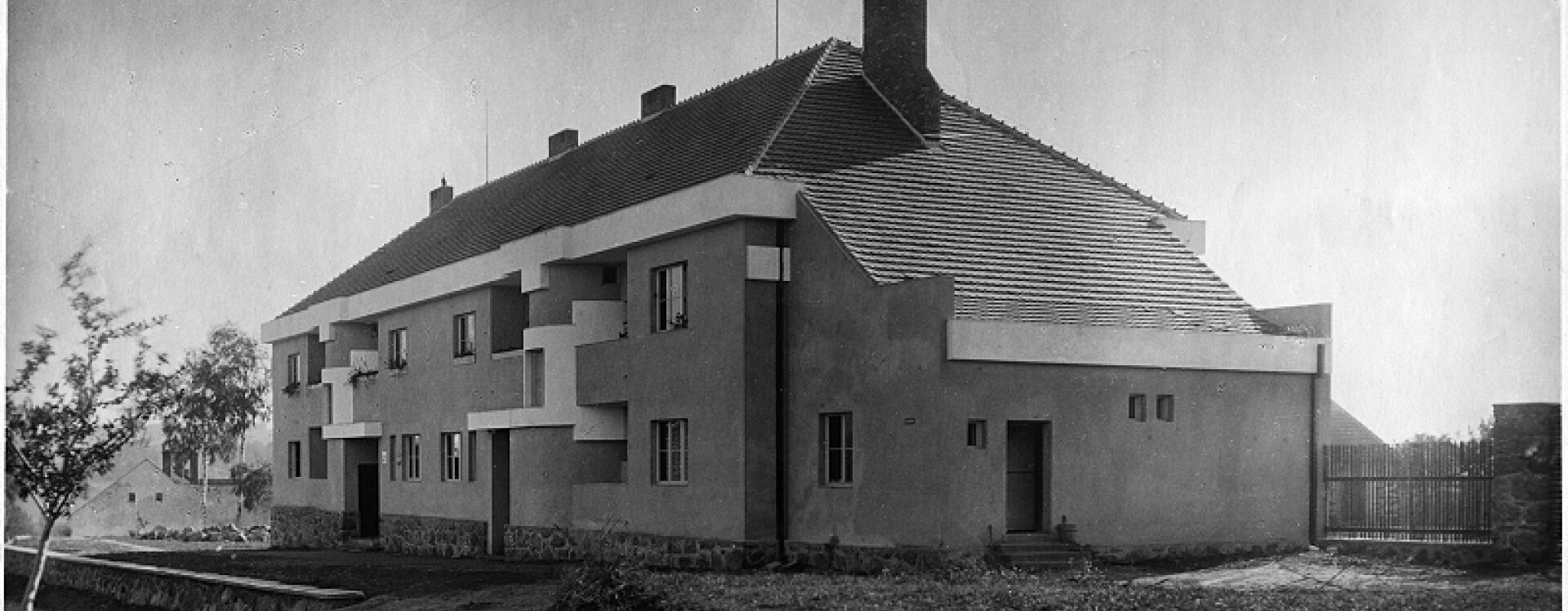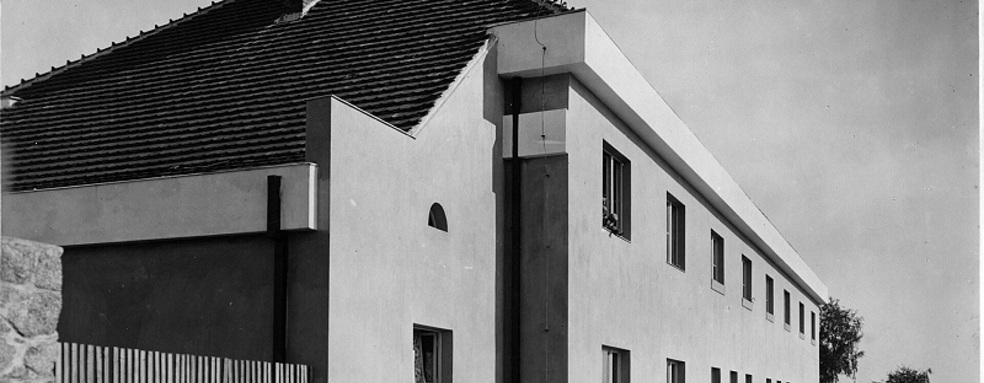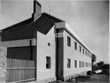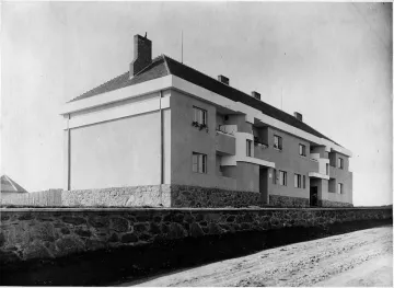 V roce 1923 byl postaven dvoupodlažní objekt ve tvaru kvádru s valbovou střechou, jehož průčelí dominují výrazné plastické články akcentované i barvou omítky. Abstraktní až antropomorfní tvary tvoří půlkruhové schodišťové rizality mezi zapuštěnými vstupy a lodžiemi v přízemí a další dvojicí lodžií v prvním patře, akcentované plastickými články ve tvaru písmene T na bíle omítnuté výrazné římse. Původní návrhy počítaly s mnohem bohatší geometrickou výzdobou průčelí i zadní fasády, ta však realizována nebyla. A tak výrazný zdobný akcent opakovaný na všech fasádách domu je mohutná římsa, na té východní je dokonce zdvojena a prolomena okapy. Římsa je aplikována i na přístavku v západní části domu, nad nějž je protažena střecha zakončená atikou.