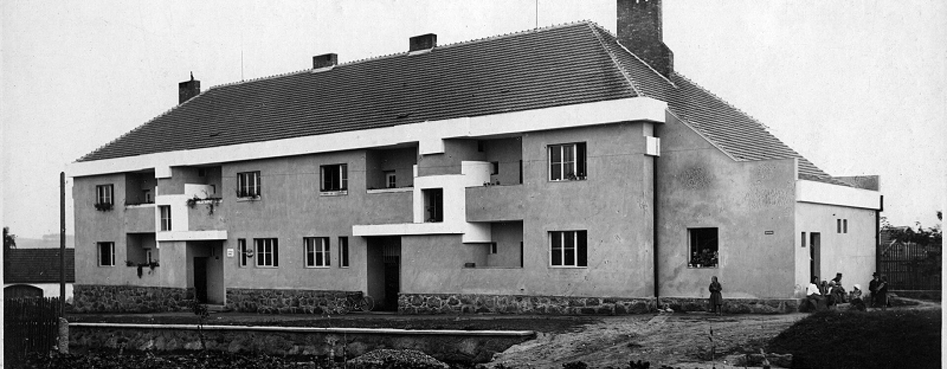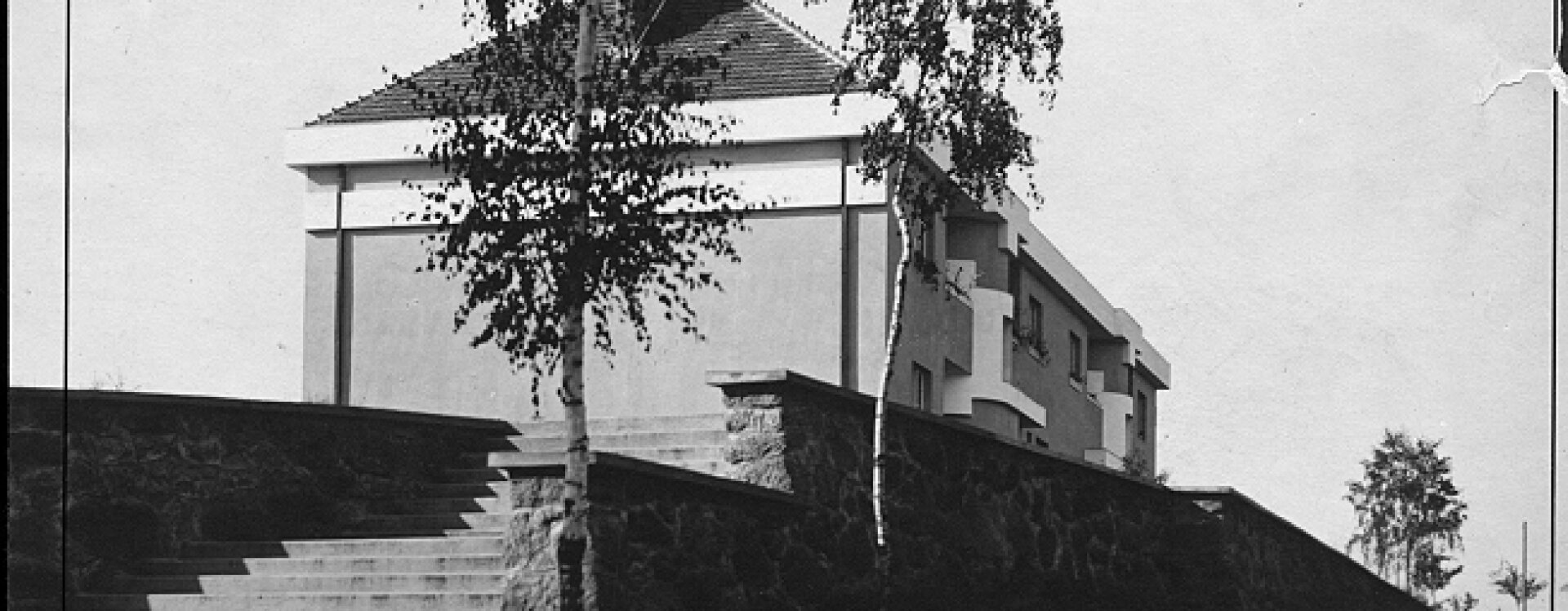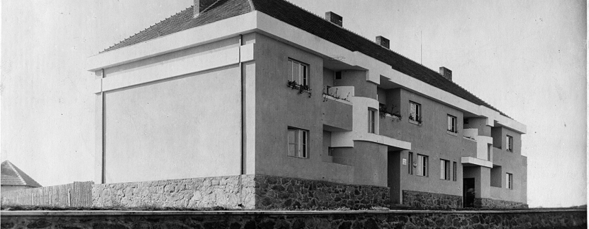 V roce 1923 byl postaven dvoupodlažní objekt ve tvaru kvádru s valbovou střechou, jehož průčelí dominují výrazné plastické články akcentované i barvou omítky. Abstraktní až antropomorfní tvary tvoří půlkruhové schodišťové rizality mezi zapuštěnými vstupy a lodžiemi v přízemí a další dvojicí lodžií v prvním patře, akcentované plastickými články ve tvaru písmene T na bíle omítnuté výrazné římse. Původní návrhy počítaly s mnohem bohatší geometrickou výzdobou průčelí i zadní fasády, ta však realizována nebyla. A tak výrazný zdobný akcent opakovaný na všech fasádách domu je mohutná římsa, na té východní je dokonce zdvojena a prolomena okapy. Římsa je aplikována i na přístavku v západní části domu, nad nějž je protažena střecha zakončená atikou.