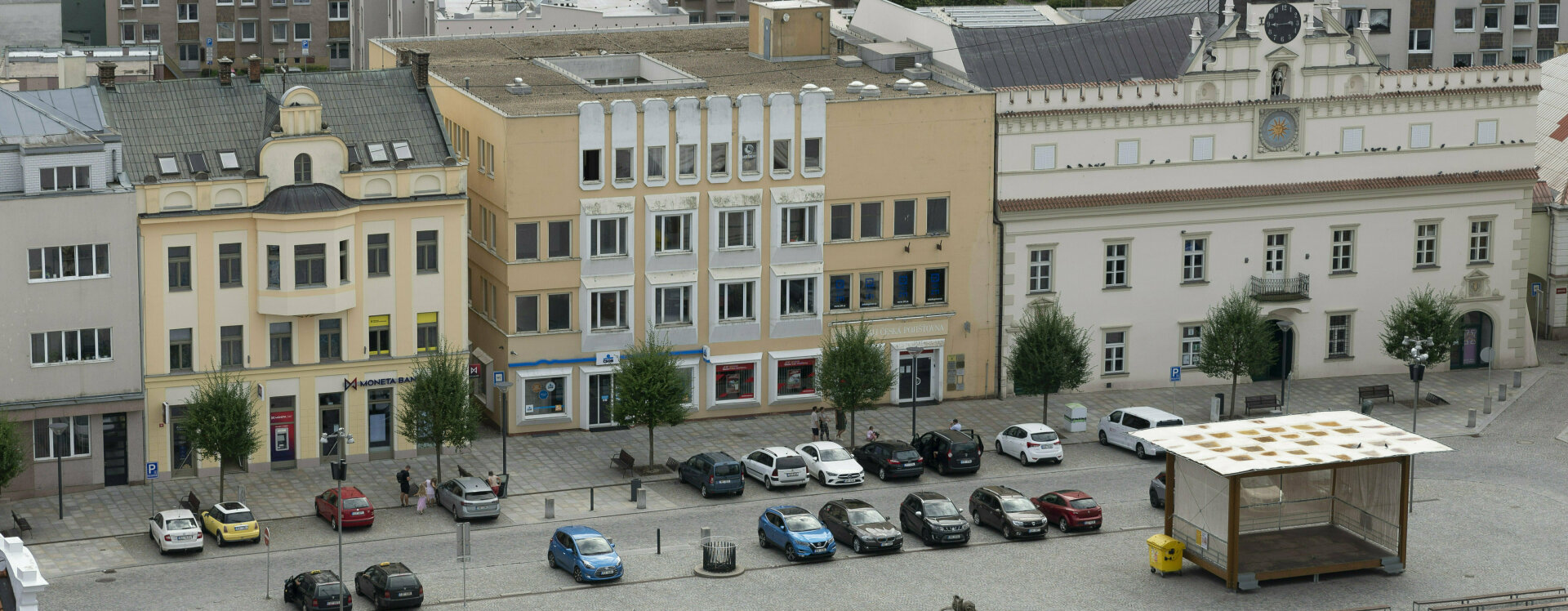 Zvolená lokalita si žádala netradiční, avšak citlivé řešení. Autor přistoupil k návrhu novostavby s respektem k okolní zástavbě a pro realizaci budovy zvolil formální kubický typ o třech poschodích, jehož výška přesně koresponduje s vedlejším objektem bývalé radnice. Invenci využil až u koncepce okenních rastrů. Šířka oken se různí podle toho, v jakých patrech se nacházejí. V přízemí široké okenní rámy nahrazují funkci vitríny, v prvním a druhém patře okna klasické šíře osvětlují kanceláře a v patře posledním úzká okna asimilují renesanční vzhled v prostorách atik. Okna nejvyššího poschodí jsou navíc osazena v plasticky pojatém vysokém rámu, který převyšuje samotnou hmotu stavby a ještě více se tak připodobňuje okolní historické zástavbě. Okna v přízemí a pomyslném středu budovy architekt umístil do vysunutých plastických rastrů připomínajících čtyřboký komolý jehlan. Plasticita fasády bývalé pojišťovny postmoderně souzní s modelací renesanční budovy v sousedství. Novostavba se nesnaží skrývat v ústraní historického objektu, ale vytěžit z jeho formy základní architektonické prvky přestrojené do tehdy moderní podoby, v případě Lubomíra Drimla v duchu principů postmoderní architektury.