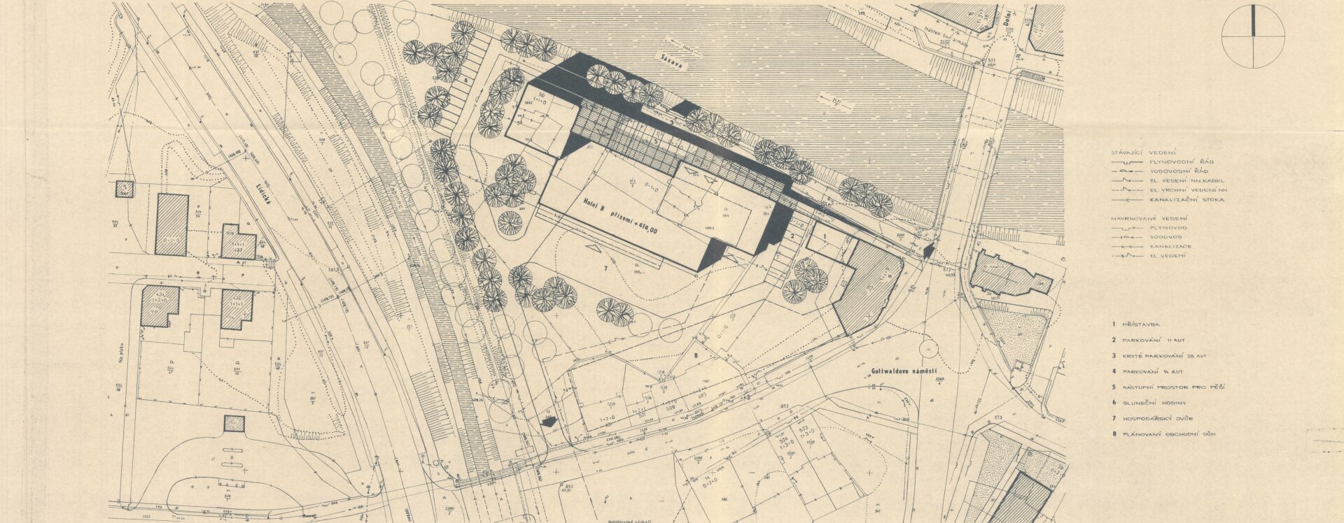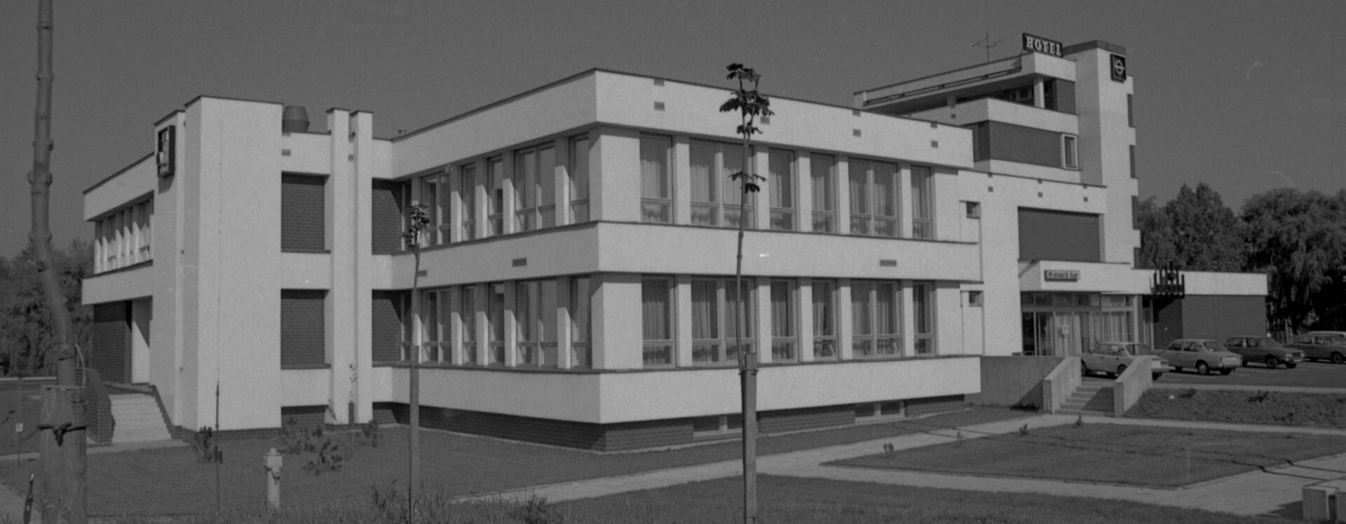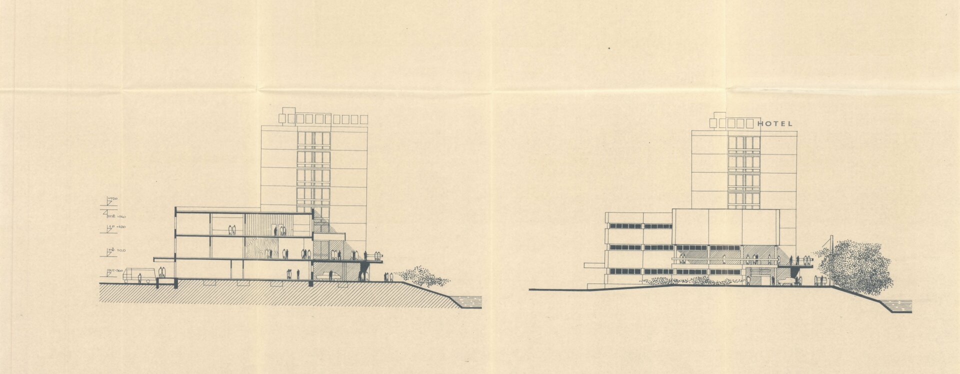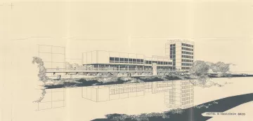 První konkrétní podobu hotelu (návrh z roku 1968), již pod patronací Restaurací Pardubice, předložil architekt Lubomír Driml (1935–2005) ze Stavoprojektu Pardubice, který v té době pro Brod dokončoval návrh sídliště v Rámech (1967, HB-VP-SN1) a obřadní síň na novém hřbitově (1967, HB-2949). Hotel s kapacitou devadesáti lůžek situoval k průmyslové škole podél hlavní komunikace. Objekt byl zároveň součástí širšího záměru na transformaci této lokality, formulovaného v Koncepci přestavby města rozpracované v podrobném územním plánu Gottwaldova náměstí (listopad 1968). Hotel zde figuruje jako integrální prvek tzv. centra občanské vybavenosti spolu s maloobchodními a službovými provozy o ploše přesahující 3 200 m². Tyto koncepce sledovaly dobovou snahu o komplexní přestavbu historické blokové zástavby ve prospěch novodobých funkcionalizovaných struktur.