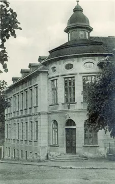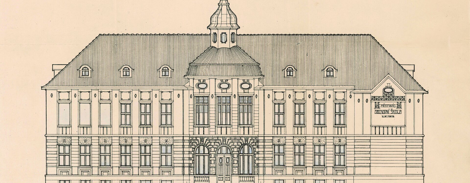 Obchodní školu navrhl zdejší stavitel Karel Ješina jako třípodlažní stavbu. Nárožní poloha se promítla i do půdorysu domu, v němž se od hlavního vstupního prostoru rozvíjejí dvě křídla určující uliční čáry obou ulic. Do suterénu Ješina umístil sklepy a byt školníka. První podlaží bylo určeno pro dvě učebny a kreslírnu, v druhém podlaží se nacházela knihovna, učebna, kabinet zbožíznalectví, teatrální učebna a ředitelna se sborovnou. Budovu postavila firma Josefa Šupicha, zkolaudována byla již vzáří roku 1914.