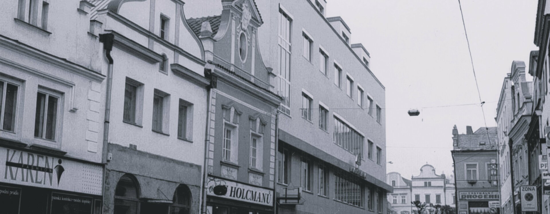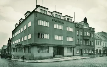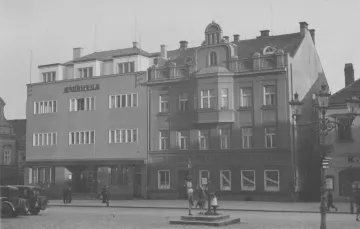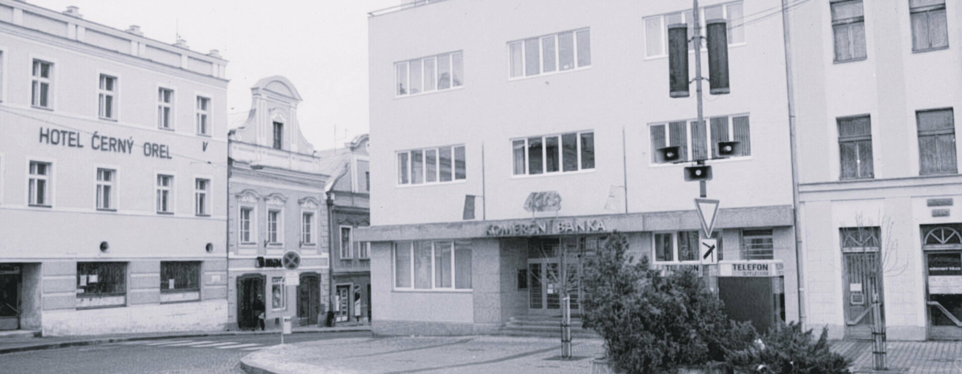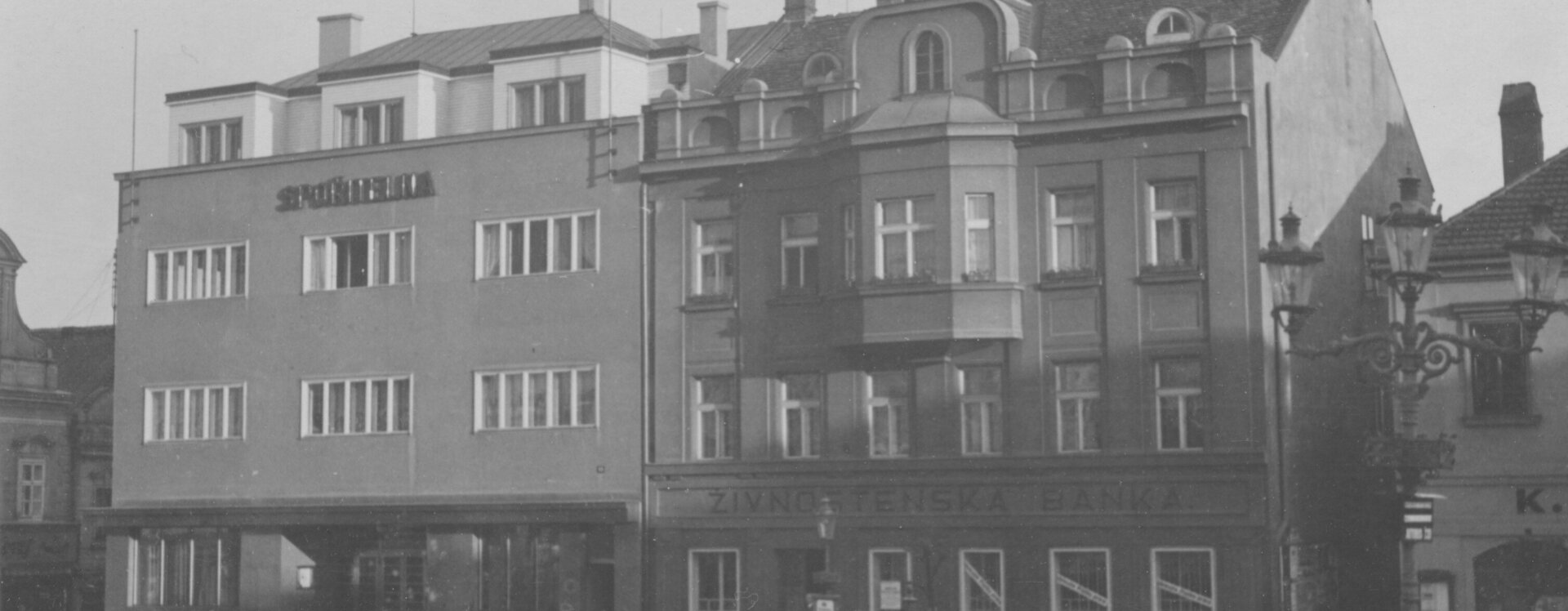 Tato vize se naplnila v červnu 1930, kdy spořitelna, tehdy již významná finanční instituce města, působící jako pobočka Národní banky československé, dokázala i přes zamítavé postoje památkového úřadu a odpor široké veřejnosti prosadit za podpory městské rady výstavbu první moderní budovy na náměstí. Objektu musely ustoupit dva domy ze 17. století s bohatě zdobenými renesančními trámovými stropy, figurující v památkových seznamech již od 20. let 20. století. Spořitelna ve svých plánech nerespektovala ani požadavek, aby na jejich místě „vystaven [byl] dům nový, který nesmí rušit starobylý ráz … náměstí“. Starosta Robert Neuern, jenž při jednáních zastupoval spořitelnu, vysvětloval kroky tím, že architekti „chtějí dobu charakterizovati dobovými stavbami“. A tak se spořitelně podařilo, i přes systematickou, téměř třicetiletou práci bývalého c. k. konzervátora města Zdeňka Wirtha a jeho kolegů památkářů, porušit tolik obdivovaný jednotný historický ráz náměstí. Architektem stavby, vzešlým ze soutěže, se stal František Albert Libra (1891–1958).