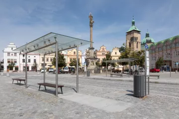 Současně vzniklo několik solitérních objektů, které se výrazně zapojují do vyznění veřejného prostoru. Jedná se o delší lavičky v půlkruhu kolem mariánského sloupu, střídané stélami s texty Karla Havlíčka Borovského a stíněné skupinou stromů. Vzniklo tak místo, kde je možné se zastavit a nadechnout a kde se současně soustředí symbolická a umělecká historická výzdoba náměstí. Další akcenty tvoří tři prameníky z mosazi a patinovaného bronzu ve třech koutech náměstí. Každý z nich má jiný tvar, ale stejnou povrchovou strukturu, která je přirozeně zapojuje do historického prostředí.