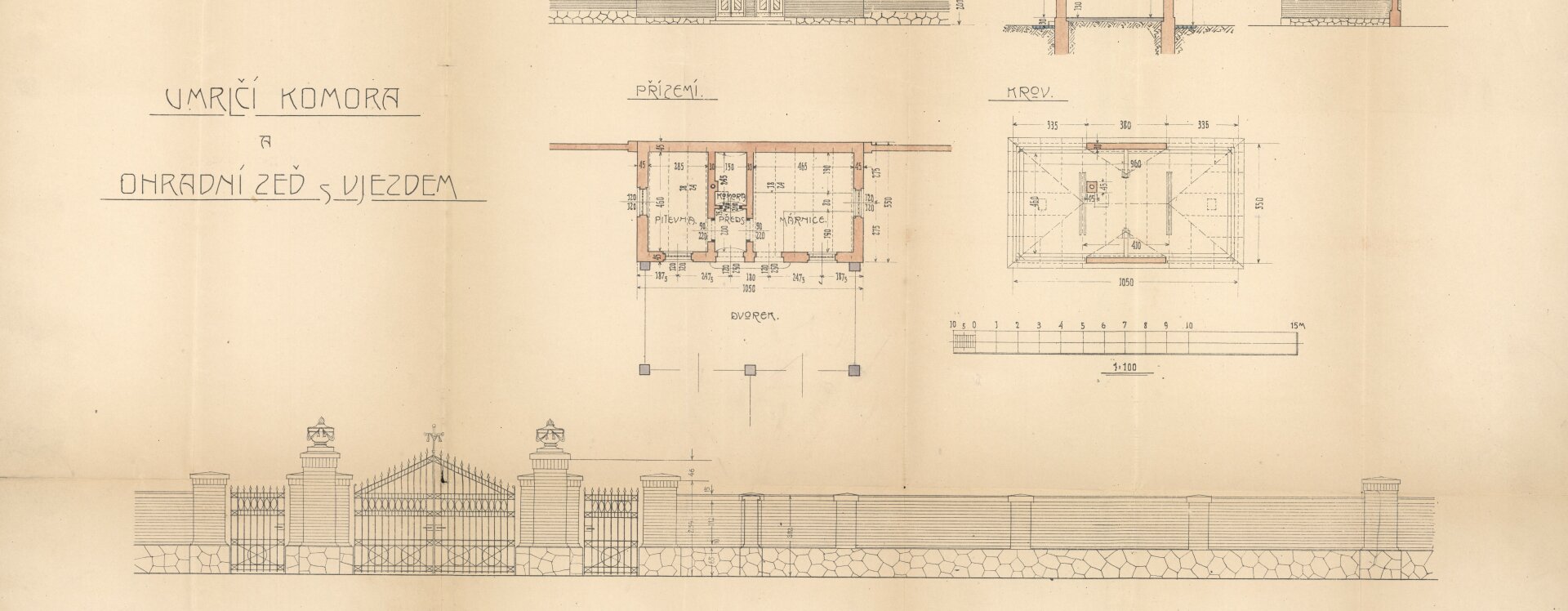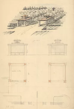 Zadání pro architektonickou soutěž na nový hřbitov vypracoval v roce 1909 zemský inženýr, architekt Prokop Frič. Realizaci vysoutěžila místní stavební firma bratrů Otakara a Františka Liškových, která navrhla podobu ohradní zdi hřbitova, oddělující plot mezi oběma částmi a přilehlou márnici s pitevnou v místech, kde se dnes nachází sociální zařízení. Projekt ještě následně revidoval Prokop Frič, který upravil vzhled ohradní zdi a budovy a navrhl uspořádání hřbitovního pozemku.