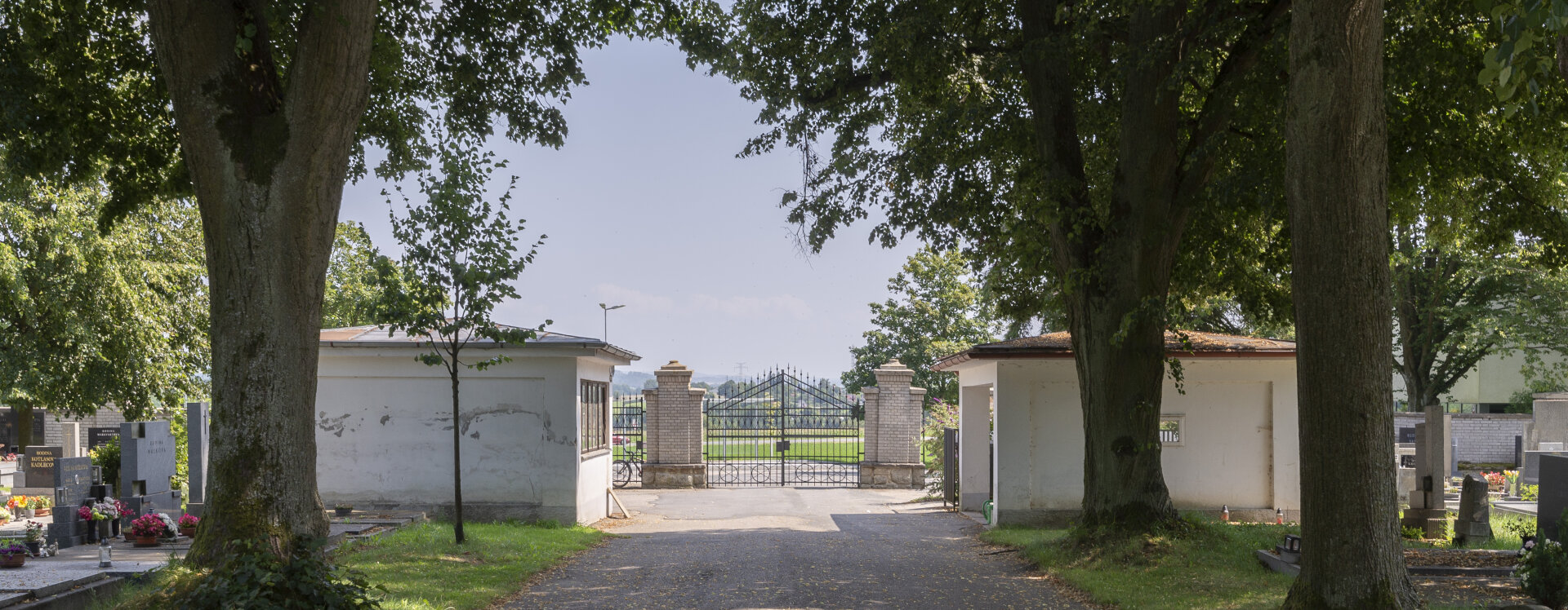 Každá část hřbitova měla vlastní bránu, původně naproti sobě na protilehlých kratších stranách pozemku. Trojboké prostranství mezi branou městského hřbitova a městskou silnicí bylo parkově upraveno, vedla tudy příjezdová štěrková cesta pro kočáry.