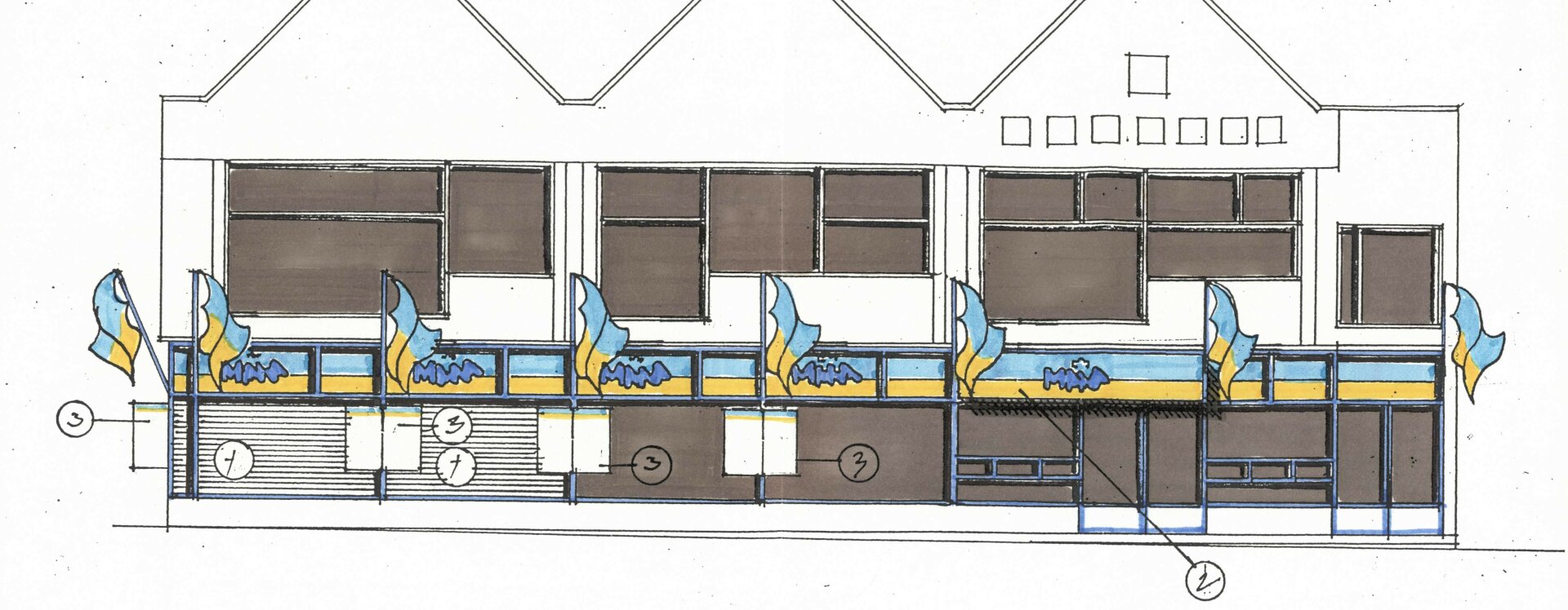 Multifunkční objekt navržený v technologii montovaného skeletu MS 71 byl zkolaudován v roce 1984 a již na počátku 90. let změnil nejen vlastníka, ale i podobu. Svou provozovnu zde v roce 1992 otevřely Potraviny Mana. Nový majitel provedl dílčí úpravy exteriéru, nové nátěry včetně osazení reklamních poutačů a reflexních fólií do oken v prvním patře. Druhé patro prošlo stavebními úpravami v roce 1998 a změnilo se v hernu s non stop provozem. Dnešní podoba stavby pochází z roku 2014 a s původním projektem má již málo společného. Dřívější trojice atikových štítů byla zbourána a nahrazena pouze dvěma štíty s malými okny osazenými ve vrcholu, velké prosklené přízemí je nyní vyzděno a osazeno pojízdnými dveřmi a klasickými okny, stejně jako v druhém patře. Drimlovy architektonické prvky na jižní fasádě byly v rámci přestavby odstraněny a původní záměr stylové návaznosti na sídliště Smetanovo náměstí I. byl touto přestavbou přerušen.