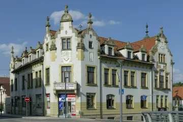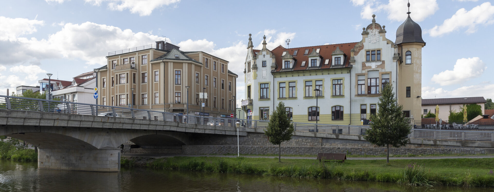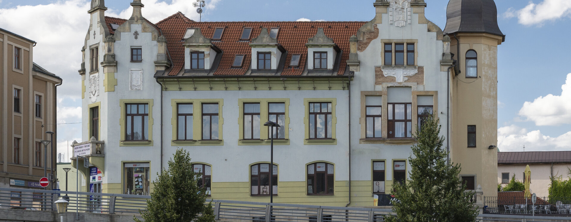 Na mírně se svažující parcele, podél pravého břehu řeky Sázavy, v těsné blízkosti tehdy jediného kamenného mostu vznikl samostatně stojící reprezentativní objekt úřadu, bohatě členěný a zdobený jemným dekorem, který vytvořil v kontextu místa jakousi „vstupní bránu“ do města.