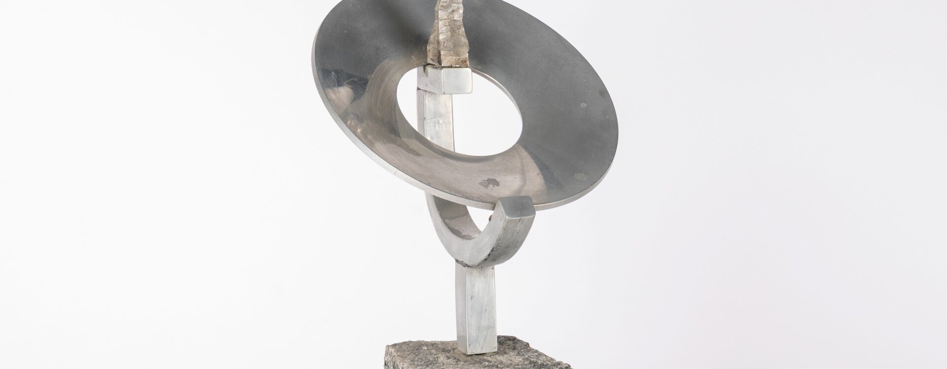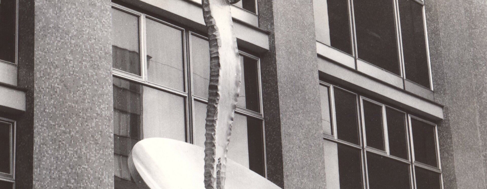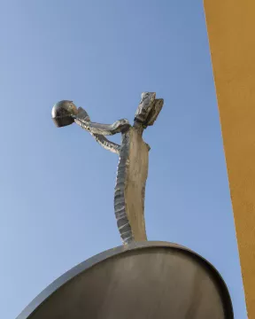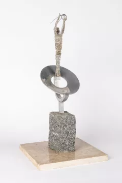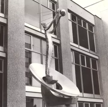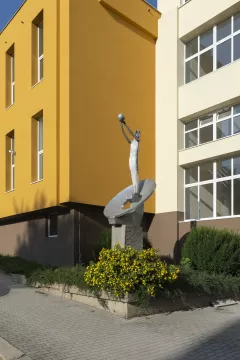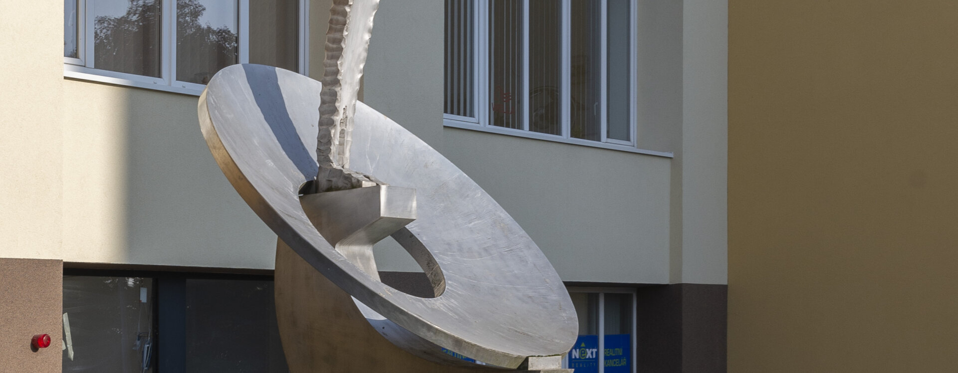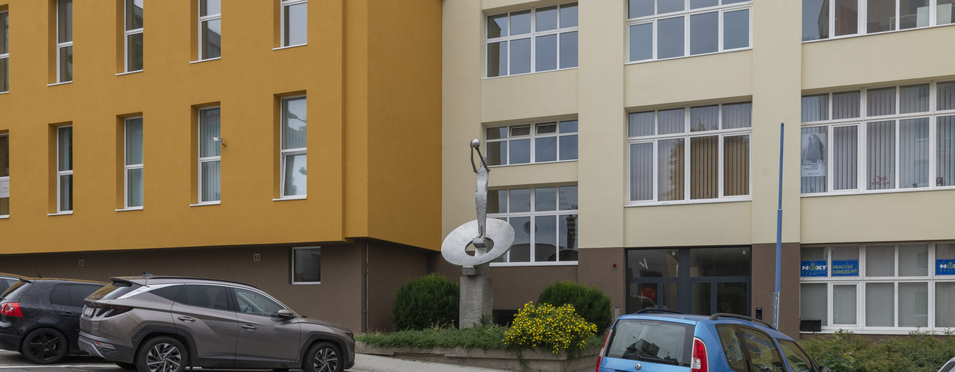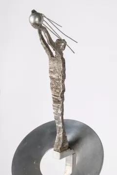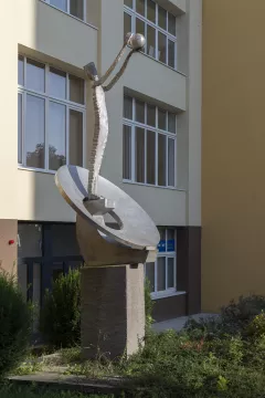 Z kovu byla vytvořena i plastika pro Brod. Schematizovaná silueta člověka z kovového pásu, na hranách jakoby hněteného prsty, zvedá v rukách družici. Postava se změkčenými konturami je umístěna na geometrické konzoli uprostřed precizně vybroušeného ocelového prstence – přijímače signálu. Jako by objekt prostřednictvím odlišné práce s materiálem poukazoval na paradox oboru, v němž se střetávají možnosti lidského myšlení a inteligentní techniky.