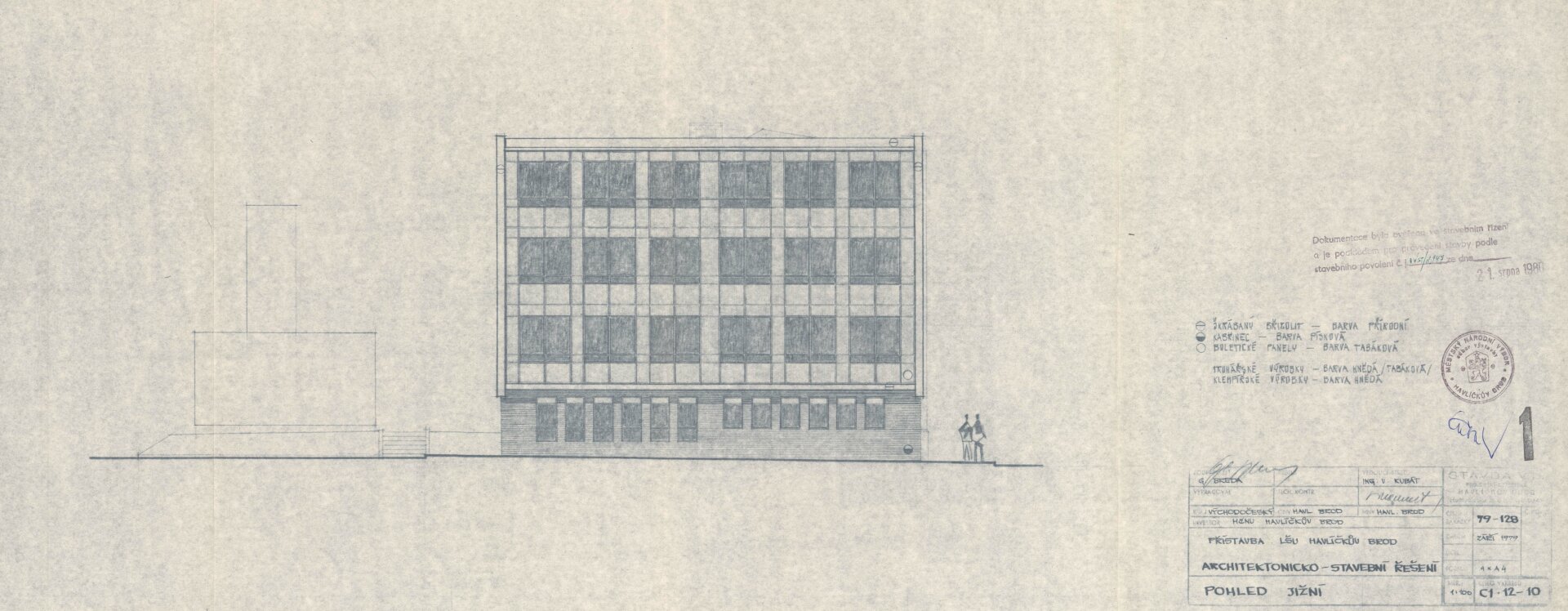 Projektant výrobního družstva Stavba v Havlíčkově Brodě Glark Breda (1944–2008) navrhl čtyřpodlažní objekt, montovaný z typizovaného modulového železobetonového skeletu, v dané době hojně využívaného pro veřejné stavby jako školy, úřady a domy služeb. Jižní fasáda byla provedena z boletických panelů, další dvě fasády byly vyzděné. Přístavba poskytla chybějící prostory, měla však i své nedostatky, především nenavazují úroveň jednotlivých pater a chybějící průchody mezi novou a starou částí budovy.