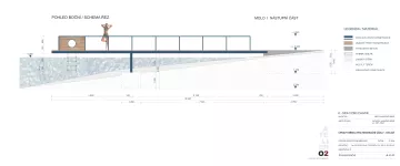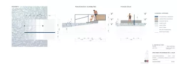 Jednotlivé prvky byly navrženy s důrazem na jednoduchost, odolnost a snadnou opravitelnost. V materiálech převažuje beton, tvrdé dřevo a ocel. Praktické řešení se spojuje s minimalistickou, avšak pečlivou estetikou, která vychází z vlastností použitých materiálů. Povrchy betonových pochozích ploch jsou opatřeny texturou, stěny menších staveb tvořené z fošen v nosných ocelových rámech dávají možnost dílčích výměn, mezery mezi fošnami umožňují odvětrávání technických částí. Přístupy do vody zahrnují jak atraktivní dlouhé molo s kruhovým průlezem pro zdatnější plavce, vybíhající dál nad hladinu, tak příbřežní molo nebo schůdky se zábradlím stranou nejrušnějších míst pro ty, kteří nemají ve vodě takovou jistotu.