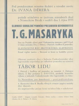 Snad v každém městě prvorepublikového Československa se zvažovalo vybudování pomníku Tomáše Gariggue Masaryka (1850–1937). V Německém (Havlíčkově) Brodě se tato myšlenka poprvé objevila v souvislosti s výstavou sochaře Jana Štursy (1880–1925), která se konala počátkem 30. let v Husově sboru a jejíž součástí byla i polopostava prezidenta z let 1920–1921.