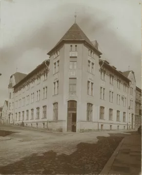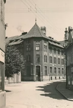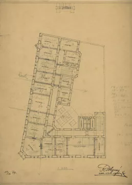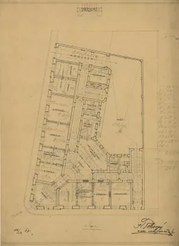Rohová dvoupatrová budova, navazující svou dispozicí na řadovou zástavbu, byla vystavěna podél Svatovojtěšské ulice, která ústila do Smetanova náměstí, kde v jejím závěru architekt navrhl vjezd do dvora. Dispozice je nepravidelná, tvořená dvěma pásy, které jsou do sebe v rohu ulice zasazeny pod úhlem 60°. Hlavní vstup, umístěný v tomto křížení do předsazené hranolové věže, jež převyšuje úroveň střechy, přecházel v interiéru v mohutnou elegantní schodišťovou halu, ze které se symetricky do stran rozbíhají chodby.