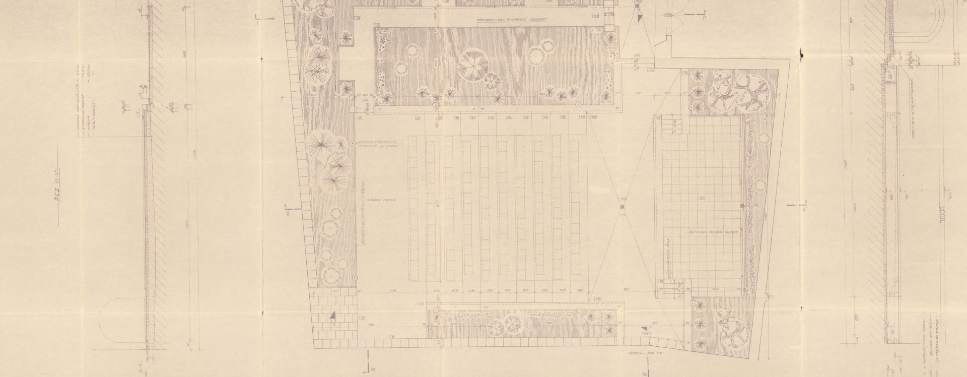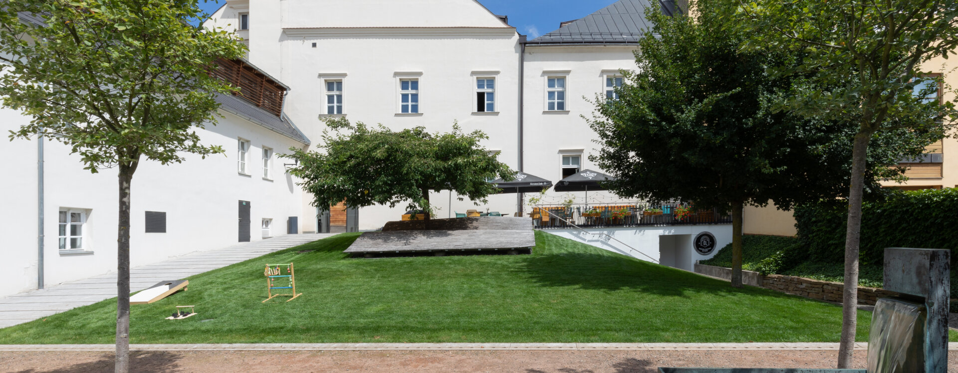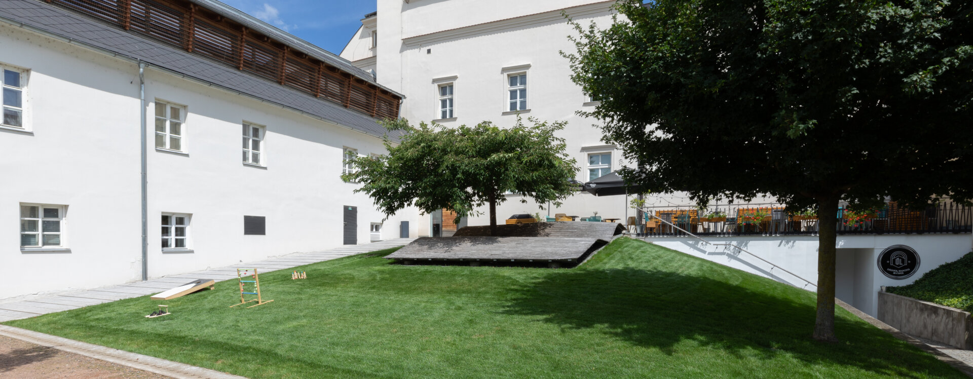Na svažitém pozemku zhruba čtvercového půdorysu tak vznikl geometricky rozdělený intimní prostor, kombinující zatravněný čtverec s dřevěnou zvlněnou odpočinkovou plochou. Trojice přírodních povrchů jej rozděluje do užitných zón sloužících jako venkovní terasa restaurace a odpočinková zóna pro veřejnost. Dvůr je vybaven moderním autorským mobiliářem, zahrnujícím kromě výše zmíněné dřevěné odpočinkové plochy i lavičky a vodní prvek v podobě kašny komorních rozměrů. Celá kompozice je doplněna sadbovou úpravou podle projektu Evy Wágnerové, využívajícího především nízkou stromovou výsadbu v kombinaci s popínavými rostlinami porůstajícími obvodové zdi.