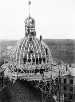První varianta spočívala ve zhotovení kopie kupole v nynější „silhoulettě“, druhá varianta navrhovala kupoli odstranit a prodloužit střechu chrámové lodi i nad kněžiště. Ani v jednom případě však nebylo možné zachránit původní fresky.