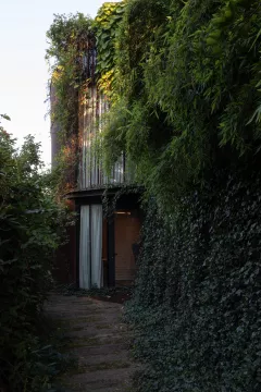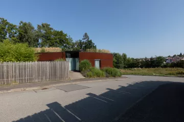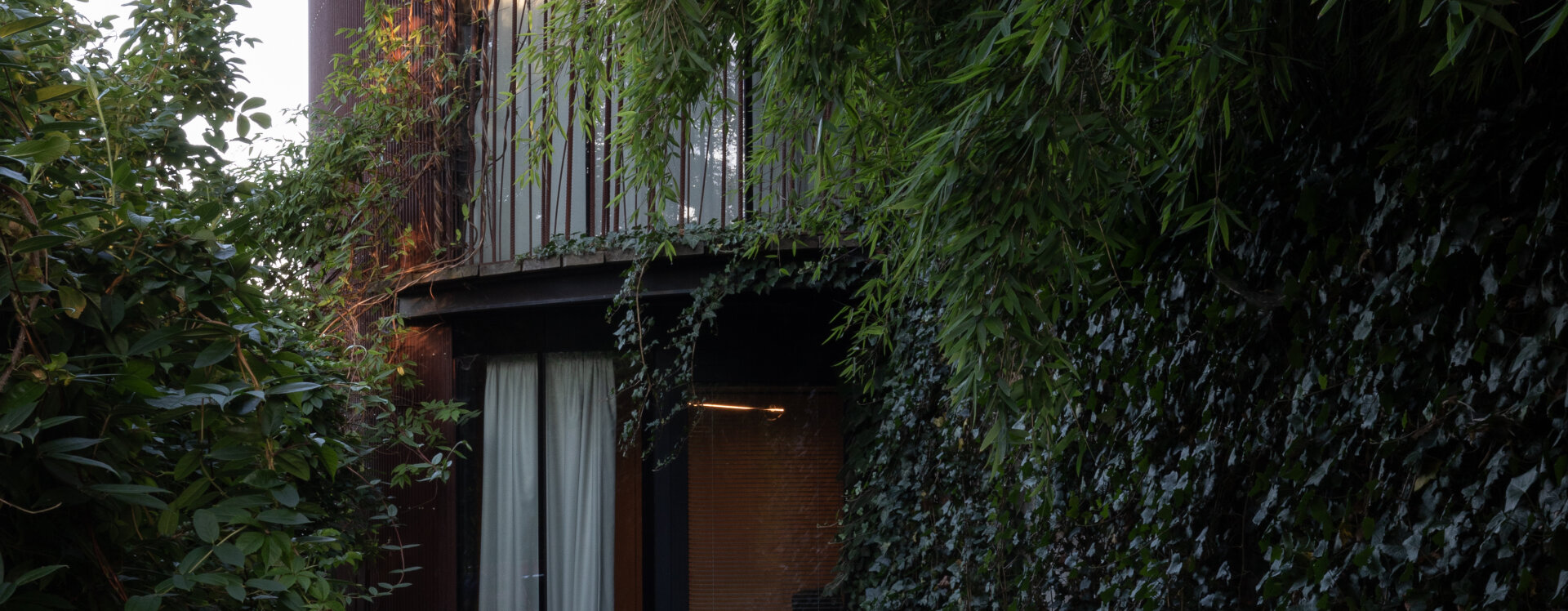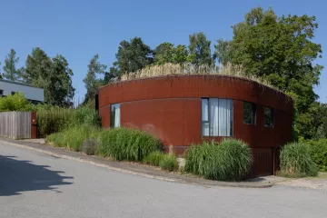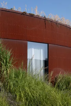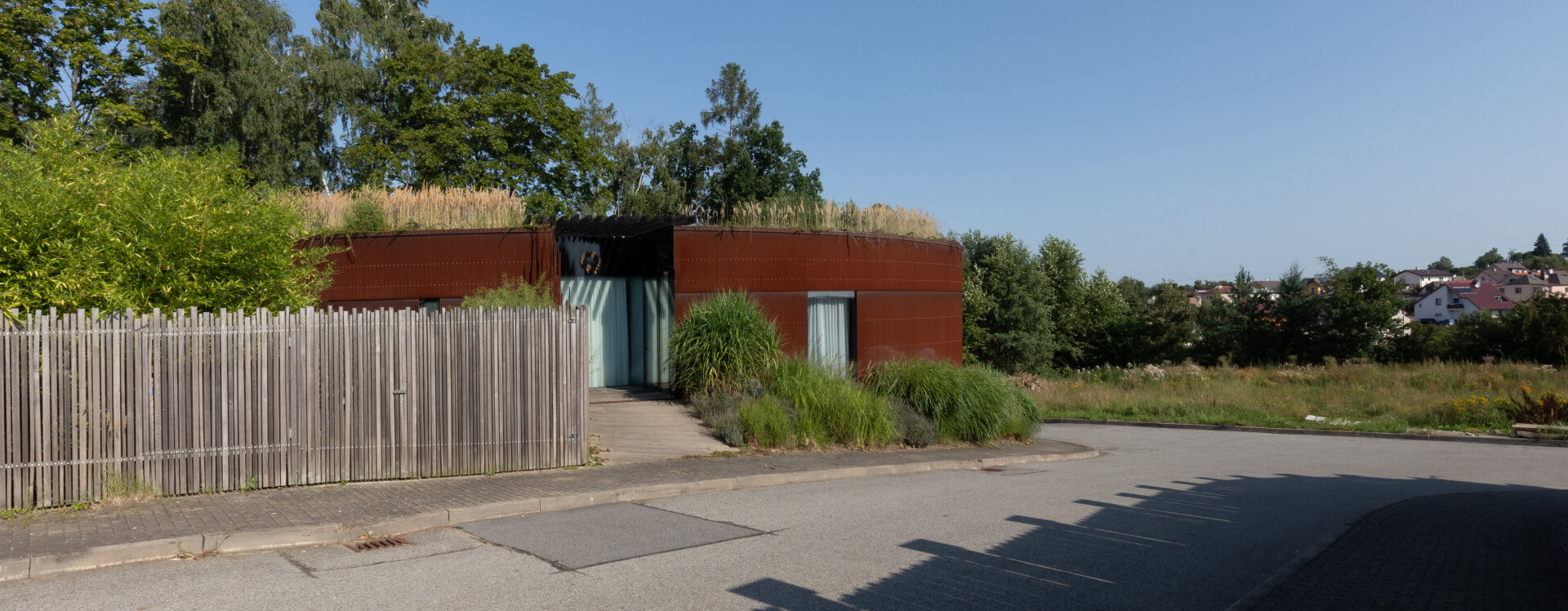 Vnější podobu domu směrem do ulice udává cortenový plech z povětrnostně odolné oceli, jenž svým zabarvením koresponduje s roxorovými tyčemi, tvořícími část plotu. Nedílnou součást domu představuje jedlá zahrada, která je od okolní zástavby odstíněna pomocí bambusového plotu a plynule přechází ve smíšený les. Budova krytá plochou střechou s extenzivní zelení ke svému provozu využívá, v souladu s celkovou ideou symbiózy s přírodou, moderní ekologicky příznivé technologie.