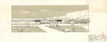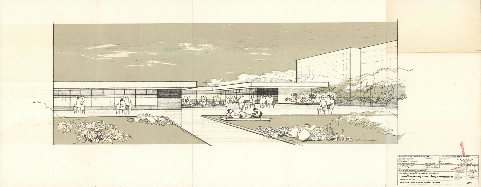 Jaroslav Fikar projektoval všechny budovy centra služeb jako přízemní, s konstrukcí z montovaných ocelových rámů a s plochou střechou, ukončenou plechovou atikou. Fasády byly zčásti obloženy skleněnou mozaikou. Budovy prodejny a restaurace k sobě přiléhaly, pavilon služeb stál samostatně, nicméně opticky všechny tři objekty vytvářely malé nádvoří, v projektu nazývané „dvůr“ nebo „atrium“. Právě sem byla nakonec umístěna pískovcová socha Jaro Vysočiny.