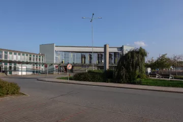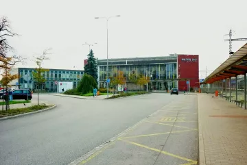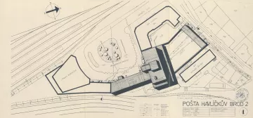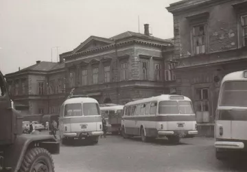 Také venkovní plocha byla řešena se záměrem vytvořit důstojný předprostor města. Po zániku původní budovy se zde otevřela příjezdová komunikace s autobusovou točnou. Doprostřed malého parku byl zasazen betonový sloup od sochařky Anny Klimešové (HB-pc2260_36), jehož keramický obklad zobrazuje zajímavé památky města.