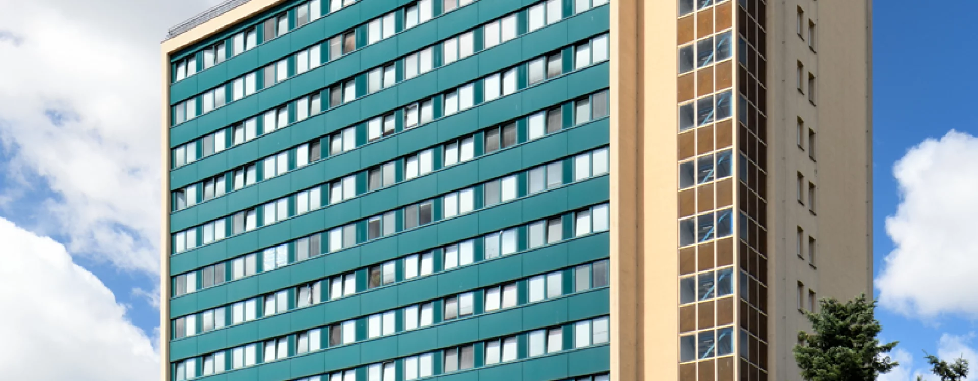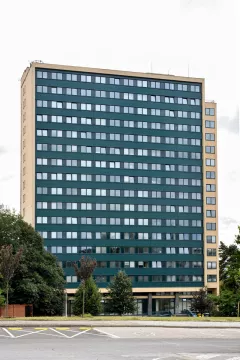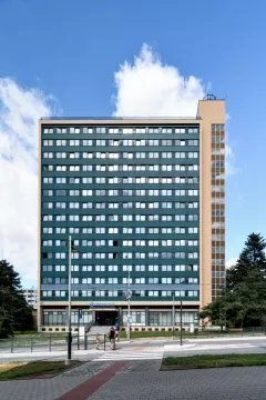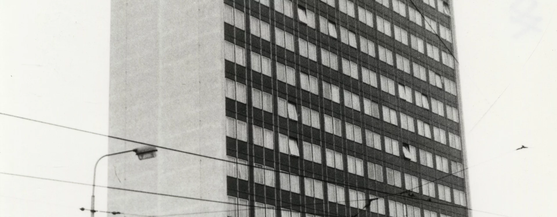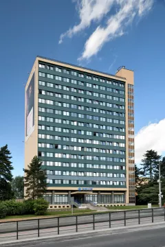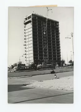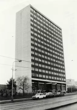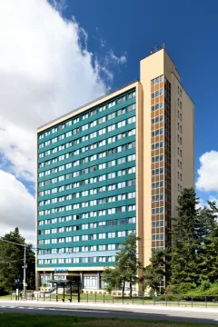 Desková výšková budova sloužila jako ubytovací objekt – hotelový dům. Konstrukčně je stavba řešena jako železobetonový monolitický skelet budovaný s pomocí ocelového bednění systému DOKA, zastřešení je plochou střechou. K severnímu průčelí bylo dodatečně přistavěno požární schodiště. Budova má obdélný půdorys s hlavními fasádami se zavěšeným obvodovým pláštěm orientovanými na východ a západ, boční fasády jsou omítané. Zavěšený obvodový plášť měl pásová okna s parapetními panely. Na jižní omítané straně byla původně instalována skleněná mozaika Žena a slunce (1979-1985) Karla Štětkáře, v současnosti odstraněná.