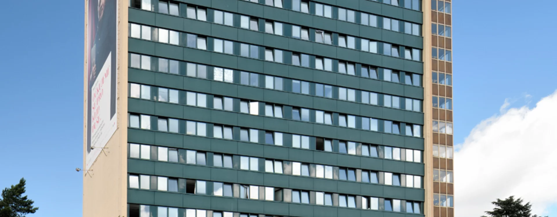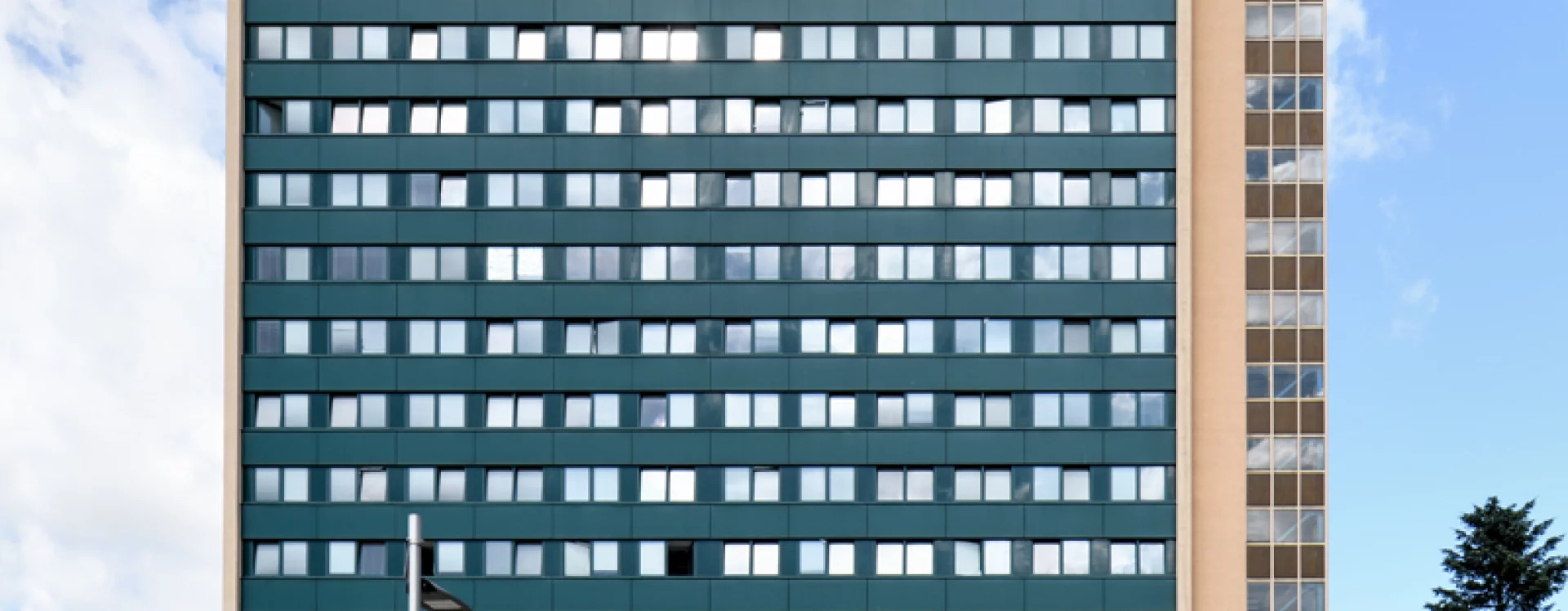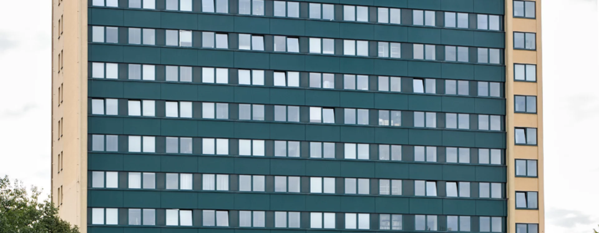 Desková výšková budova sloužila jako ubytovací objekt – hotelový dům. Konstrukčně je stavba řešena jako železobetonový monolitický skelet budovaný s pomocí ocelového bednění systému DOKA, zastřešení je plochou střechou. K severnímu průčelí bylo dodatečně přistavěno požární schodiště. Budova má obdélný půdorys s hlavními fasádami se zavěšeným obvodovým pláštěm orientovanými na východ a západ, boční fasády jsou omítané. Zavěšený obvodový plášť měl pásová okna s parapetními panely. Na jižní omítané straně byla původně instalována skleněná mozaika Žena a slunce (1979-1985) Karla Štětkáře, v současnosti odstraněná.