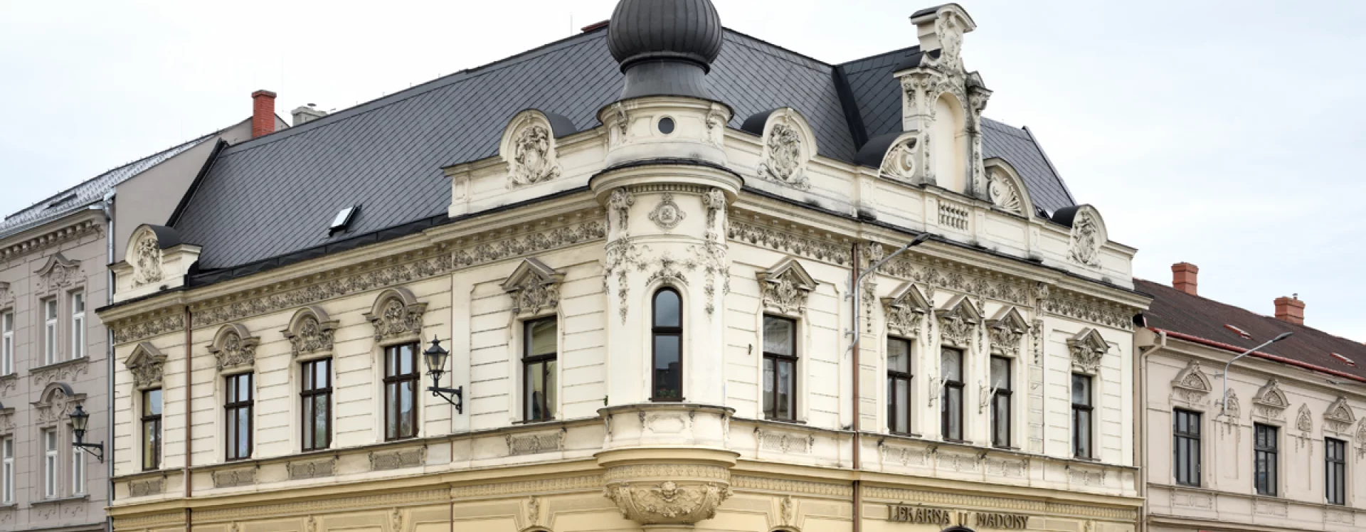 Náměstí a Nádražní ulice byly zastavěny obvykle nájemními domy s obchodem nebo provozovnou v parteru a byty v patře (patrech). Projektovali je většinou místní stavitelé a architekti. Jedním z prvních domů, který v novém Přívoze vznikl, byl novobarokní nájemní dům s lékárnou U Madony na Nádražní ulici. Podle návrhu moravskoostravských stavitelů Aloise Mihatsche a Hanse Ulricha si ho nechala v letech 1894–1895 vystavět obec Přívoz již s předpokladem, že v něm bude umístěna lékárna. Přívoz do té doby neměl vlastní lékárnu (nejbližší byla vzdálená hodinu a půl pěšky), proto obec spolu s největším zdejším zaměstnavatelem, Severní dráhou Ferdinandovou, již od roku 1892 prosazovala zřízení veřejné lékárny, což se stalo v roce 1893. Koncesi na její provozování získal po delších peripetiích lékárník Emil Kinský, který dosud působil v olomoucké lékárně U Černého orla. Slavnostní kolaudace nově postaveného domu a lékárny proběhla 10. září 1895.
