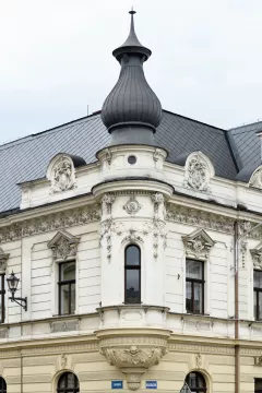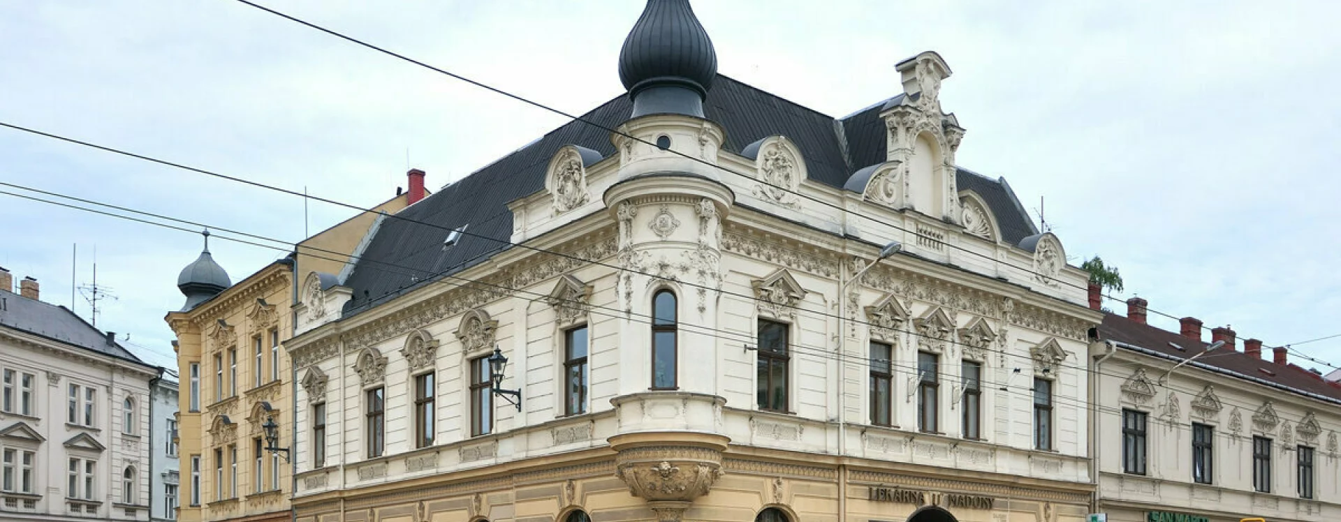 Dvoukřídlý jednopatrový dům vystavěný v exponované poloze na nároží při hlavní přívozské komunikaci v přímém kontaktu s náměstím a přímo naproti kostelu Neposkvrněného početí Panny Marie se obrací hlavním průčelím do Nádražní ulice. Mihatsch a Ulrich se zaměřili na akcentování jeho nárožní polohy formou oválného arkýře završeného štíhlou barokizující helmicí. Plochy fasád v parteru i patře členili pásovou rustikou, okna v patře opatřili trojúhelnými, resp. segmentovými frontony. Průčelí do Nádražní ulice a nároží završovala vysoká korunní římsa se štítky a volutovým štítem v trojosém vstupním rizalitu. Na frontonech, podokenních parapetech, římsách i štítech se rozvíjí bohatý barokizující štukový dekor. Do lékárny se původně vcházelo půlkruhově zakončeným vstupem, jenž měl po stranách obdobně utvářená okna, v druhé polovině 20. století ale byly tyto tři osy proraženy a nahrazeny širokým proskleným vstupem s výkladci. Koncem 20. století vznikla současná dřevěná konstrukce. Zatímco přízemí domu sloužilo (a dodnes slouží) pro potřeby lékárny, patro zaujímal byt lékárníka a jeho rodiny se samostatným vchodem z tehdejší Stefaniiny ulice (Stefaniegasse, dnes Chopinova).