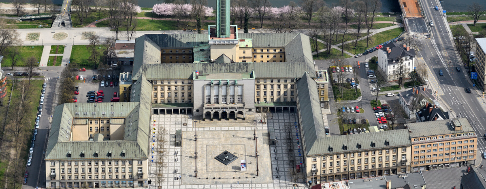 Od středověku až do dvacátých let 20. století sloužila Moravské Ostravě budova radnice na tehdejším náměstí (dnes Masarykovo náměstí). Narůstající potřeby zvětšujícího se města si ale vyžádaly stavbu nového radničního objektu. Zásadním impulsem se stal plán sloučení Moravské Ostravy s okolními moravskými obcemi (Vítkovicemi, Přívozem, Zábřehem, Mariánskými Horami, Hrabůvkou a Novou Vsí) a vytvoření Velké Ostravy. Zároveň byl v roce 1920 přijat zákon o župním zřízení, který počítal s vytvořením zcela nových územněsprávních jednotek – žup –, pro něž měla příslušná města (centra žup) zajistit odpovídající objekty. Moravská Ostrava proto začala řešit výstavbu budovy, do níž by bylo možné umístit jak úřady městské samosprávy, tak kanceláře župy. Z několika zvažovaných pozemků si město nakonec vybralo území Nové střelnice v blízkosti řeky Ostravice, které sice leželo stranou dosavadního historického centra, ale bylo v dosahu dalších úřadů, institucí i ředitelství důležitých podniků, navíc bylo dobře dostupné a okolí dovolovalo vytvořit i důstojné náměstí.