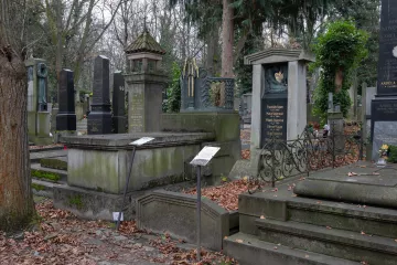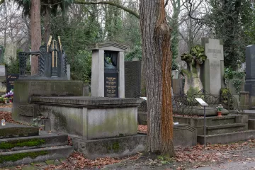 Jan Kotěra se zabýval funerální tvorbou v posledních dvaceti letech svého života. Výsledkem byla ve své době nečekaně nová a velmi inspirativní díla. Každý z náhrobků je jiný (jen na Olšanských hřbitovech jich můžeme dodnes porovnat jedenáct), ale všechny spojuje nejvyšší kompoziční kvalita, výběr ušlechtilého kamene i soulad architektury a případné sochařské výzdoby a kovových doplňků, v tomto případě kované bronzové lucerny opět z dílny Franty Anýže (na historickém snímku).
