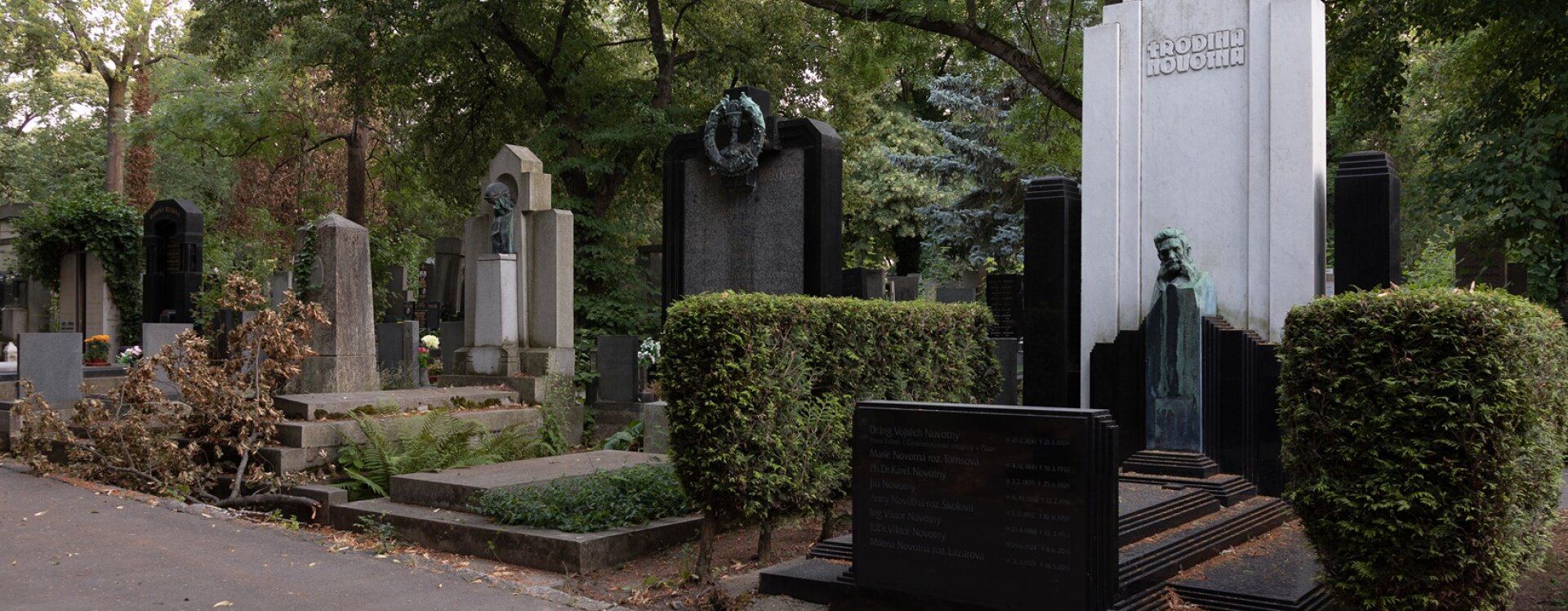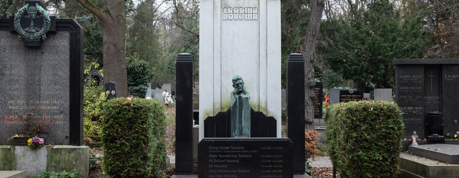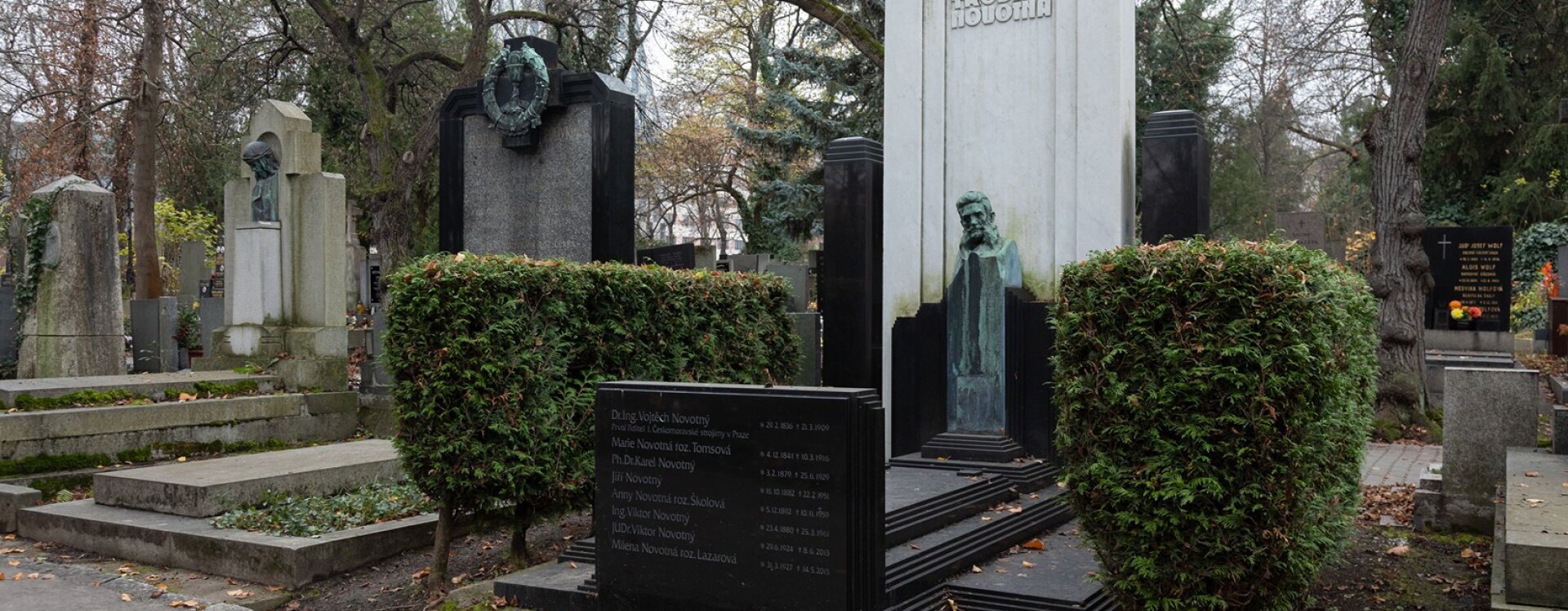 Hrobku rodiny Novotných můžeme vnímat jako jednu z nejskvostnějších ukázek geometrizující secese ve funerálním umění. V roce 1909 ji po smrti svého manžela Dr. Ing. Vojtěcha Novotného, prvního ředitele I. československé strojírny v Praze, zřídila Marie Novotná a návrhem architektonické podoby pověřila žáka Jana Kotěry Otakara Novotného (1880‒1959; shoda jmen objednatele a architekta je pravděpodobně náhodná), který patřil mezi nejvýznamnější české architekty první poloviny 20. století. V každé etapě své tvorby, od secese přes kubismus až po funkcionalismus, za sebou zanechal pozoruhodné stavby. Mezi jeho stěžejní díla patří pozdně secesní Štencův dům, kubistický obytný blok zvaný Učitelské domy (obojí na Starém Městě pražském), areál letiště Kbely či funkcionalistická budova SVU Mánes, kterou navrhl jako předseda tohoto spolku.