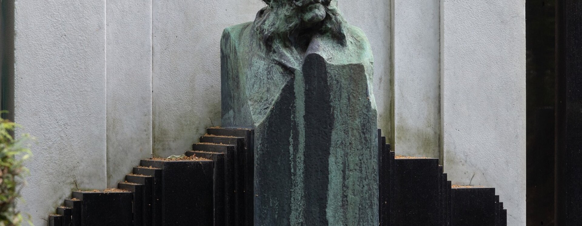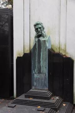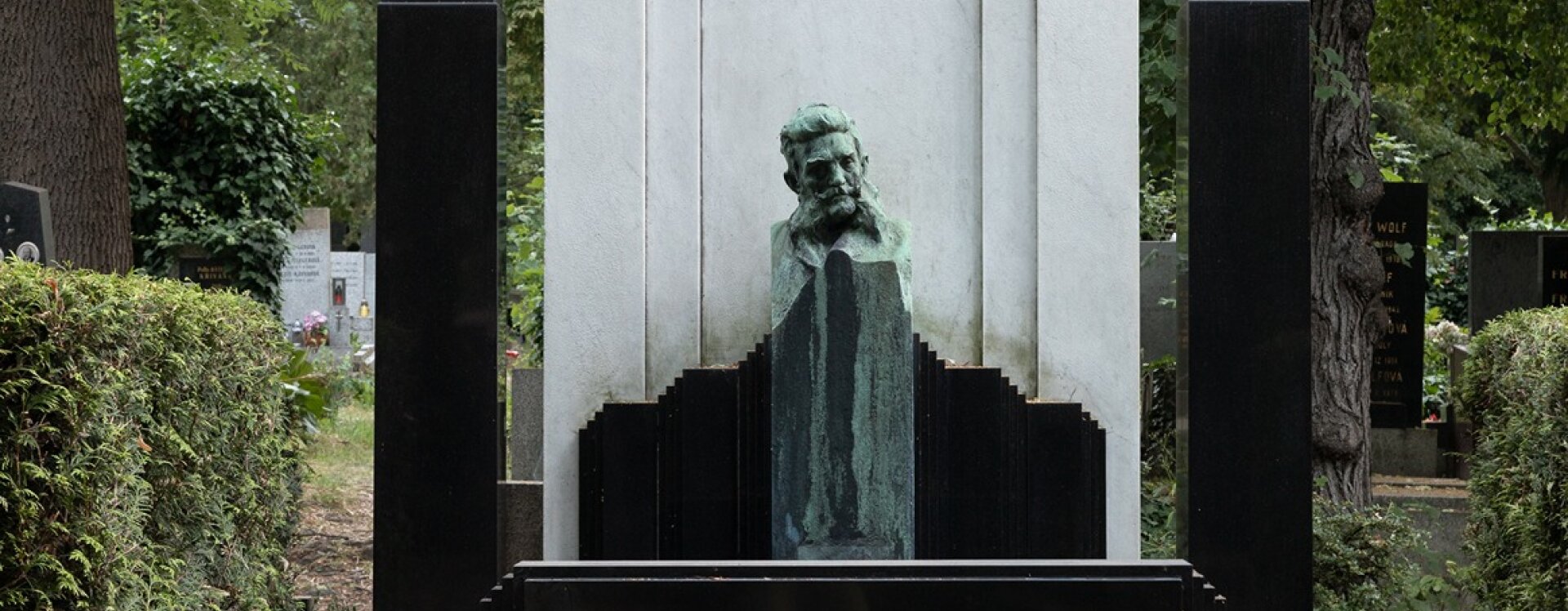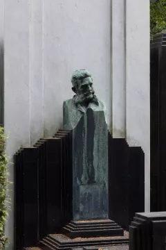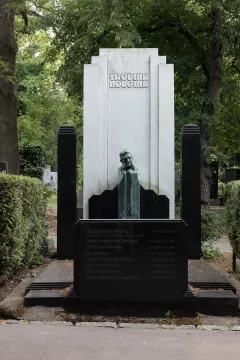 Hrobku pojednal jako jakési lůžko, které tvoří v hlavách vysoká stéla s podobiznou zesnulého a v nohách nižší nápisová deska. Toto prostorově nevšední řešení umocňuje hlavně kontrast exkluzivního bílého a černého materiálu, o jehož volbě mimo jiné vypovídá oznámení kamenické firmy Ludvíka Šaldy z roku 1909: „... spodní stavba bude na tři etáže se spodním prostorem pro zadržení vody vyzděná z cihel na cementovou maltu, vrchní stavba bude z černé švédské žuly leštěné a bílého mramoru carrarského, ozdoby a poprsí z bronzu.“ Hrobka je díky dokonalé souhře geometrických ploch a barevného kontrastu kamene vizuálně nesmírně působivá. Vysoká bílá stéla, na zadní straně zdobená písmenem „N“, je lemována dvojicí černých obelisků. Z černého materiálu je rovněž vodorovná plocha rovu a přední nápisová deska s moderním reliéfním písmem, která byla roku 2016 překryta deskou s nápisem novým.