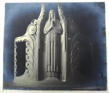 Složitou olšanskou plastiku vymodeloval podle Kotěrova návrhu sochař Vojta Sucharda a odlil Václav Mašek. V roce 2012 byl bronzový anděl neznámým pobertou odřezán od soklu, některé postranní části byly ukradeny, zbytek však naštěstí našla v blízkém křoví externí spolupracovnice hřbitovní správy, geoložka Drahomíra Březinová. Chybějící části byly doplněny a hrobka odborně zrestaurována. Dnes je zde osazena kopie z epoxidové pryskyřice, Suchardův originál se nachází v depozitáři.